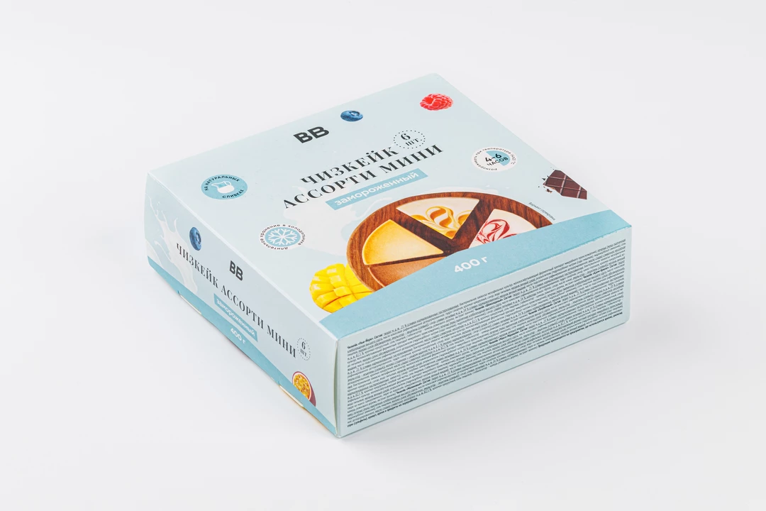 Чизкейк «Нью-Йорк» (творог м.д.ж. 25% (сливки нормализованные пастеризованные, бактериальная закваска мезофильных культур, молокосвертывающий ферментный препарат микробного происхождения), печенье (мука пшеничная хлебопекарная высшего сорта, масло кокосовое рафинированное дезодорированное, пудра сахарная, крахмал кукурузный, сахар, вода питьевая, меланж яичный сухой, разрыхлители (гидрокарбонат натрия (сода пищевая), гидрокарбонат аммония), соль пищевая, молоко сухое обезжиренное, эмульгатор - лецитины (соевый)), сахар, сливки питьевые м.д.ж. 34% (сливки нормализованные), меланж яичный жидкий, масло подсолнечное рафинированное дезодорированное, масло сладко-сливочное несоленое м.д.ж. 82,5%, крахмал кукурузный, соль пищевая, стабилизатор - камедь рожкового дерева, экстракт ванили). Чизкейк «Шоколадный» (творог м.д.ж. 25% (сливки нормализованные пастеризованные, бактериальная закваска мезофильных культур, молокосвертывающий ферментный препарат микробного происхождения), печенье (мука пшеничная хлебопекарная высшего сорта, масло кокосовое рафинированное дезодорированное, пудра сахарная, сахар, какао-порошок, крахмал кукурузный, вода питьевая, молоко сухое обезжиренное, разрыхлители (гидрокарбонат натрия (сода пищевая), гидрокарбонат аммония)), сахар, сливки питьевые м.д.ж. 34%, шоколад (какао тертое, сахар, масло какао, эмульгатор - лецитины (соевый)), меланж яичный жидкий, масло подсолнечное рафинированное дезодорированное, масло сладко-сливочное несоленое м.д.ж. 82,5%, крахмал кукурузный, соль пищевая, стабилизатор - камедь рожкового дерева, экстракт ванили). Чизкейк «Крем-брюле» (творог м.д.ж. 25% (сливки нормализованные пастеризованные, бактериальная закваска мезофильных культур, молокосвертывающий ферментный препарат микробного происхождения), печенье (мука пшеничная хлебопекарная высшего сорта, масло кокосовое рафинированное дезодорированное, пудра сахарная, крахмал кукурузный, сахар, вода питьевая, меланж яичный сухой, разрыхлители (гидрокарбонат натрия (сода пищевая), гидрокарбонат аммония), соль пищевая, молоко сухое обезжиренное, эмульгатор - лецитины (соевый)), молоко сгущенное с сахаром вареное м.д.ж. 8,5% (молоко нормализованное, сахар (сахароза)), сливки питьевые м.д.ж. 34% (сливки нормализованные), меланж яичный жидкий, сахар, масло подсолнечное рафинированное дезодорированное, крахмал кукурузный, масло сладко-сливочное несоленое м.д.ж. 82,5%, соль пищевая, стабилизатор - камедь рожкового дерева, экстракт ванили). Чизкейк «Голубичный» (творог м.д.ж. 25% (сливки нормализованные пастеризованные, бактериальная закваска мезофильных культур, молокосвертывающий ферментный препарат микробного происхождения), печенье (мука пшеничная хлебопекарная высшего сорта, масло кокосовое рафинированное дезодорированное, пудра сахарная, крахмал кукурузный, сахар, вода питьевая, меланж яичный сухой, разрыхлители (гидрокарбонат натрия (сода пищевая), гидрокарбонат аммония), соль пищевая, молоко сухое обезжиренное, эмульгатор - лецитины (соевый)), сметана м.д.ж. 20% (сливки нормализованные пастеризованные, закваска), сахар, голубика замороженная, сливки питьевые м.д.ж. 34 % (сливки нормализованные), меланж яичный жидкий, масло подсолнечное рафинированное дезодорированное, масло сладко-сливочное несоленое м.д.ж. 82,5%, крахмал кукурузный, голубой чай матча, со