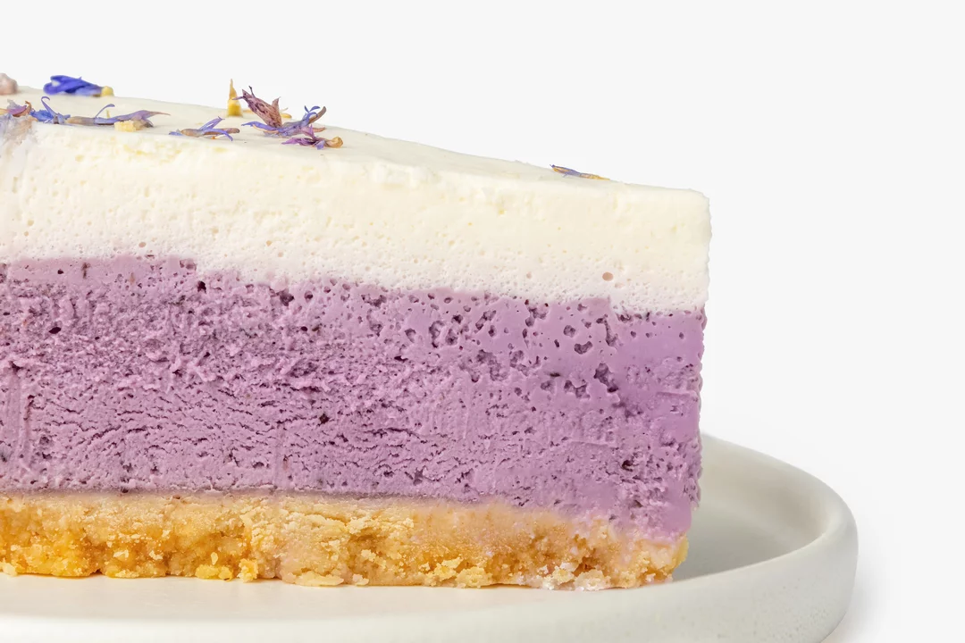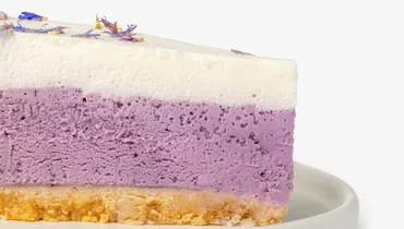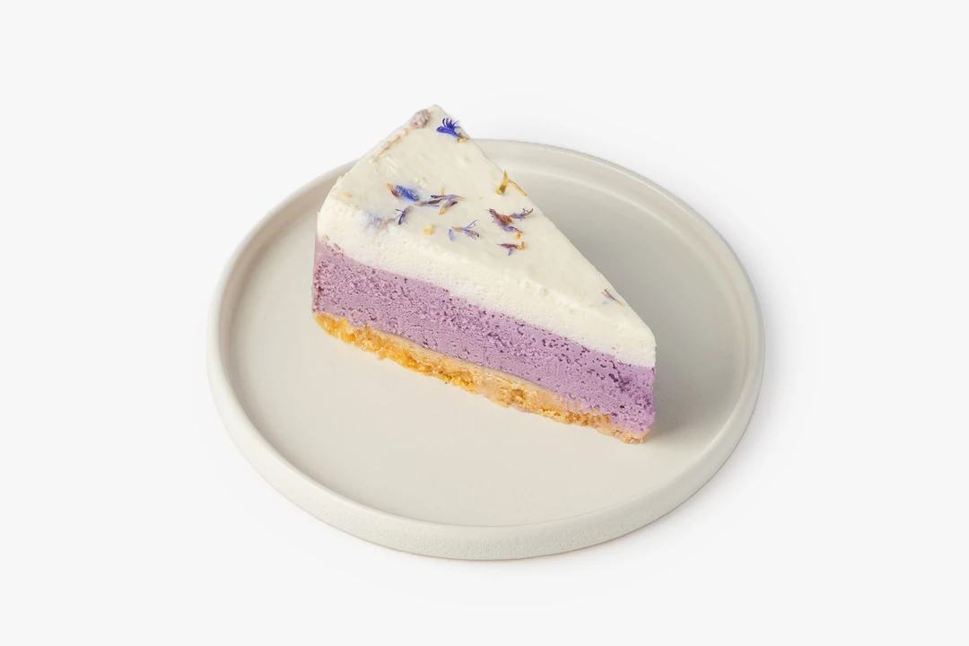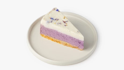 Воздушный чизкейк с черничным вкусом. В его основе песочный корж на миндальной муке. Сверху лёгкий чернично-йогуртовый мусс и нежный сливочный слой с лепестками василька.