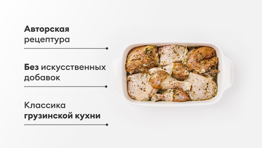 Сочный цыплёнок по грузинскому рецепту, замаринованный в молочно-чесночном соусе с насыщенной приправой хмели-сунели. Готовим из грудки, голеней и бёдрышек без добавления консервантов и усилителей вкуса. В этом блюде есть всё, за что мы так любим грузинскую кухню: оно очарует богатыми пряными ароматами и насытит даже самого голодного. Гарнир к мясу не обязателен, а вот свежие овощи и ломтик хлеба шоти будут очень кстати. Переложите мясо из упаковки в посуду для запекания и отправьте в разогретую до 180ºС духовку на 35–45 минут.