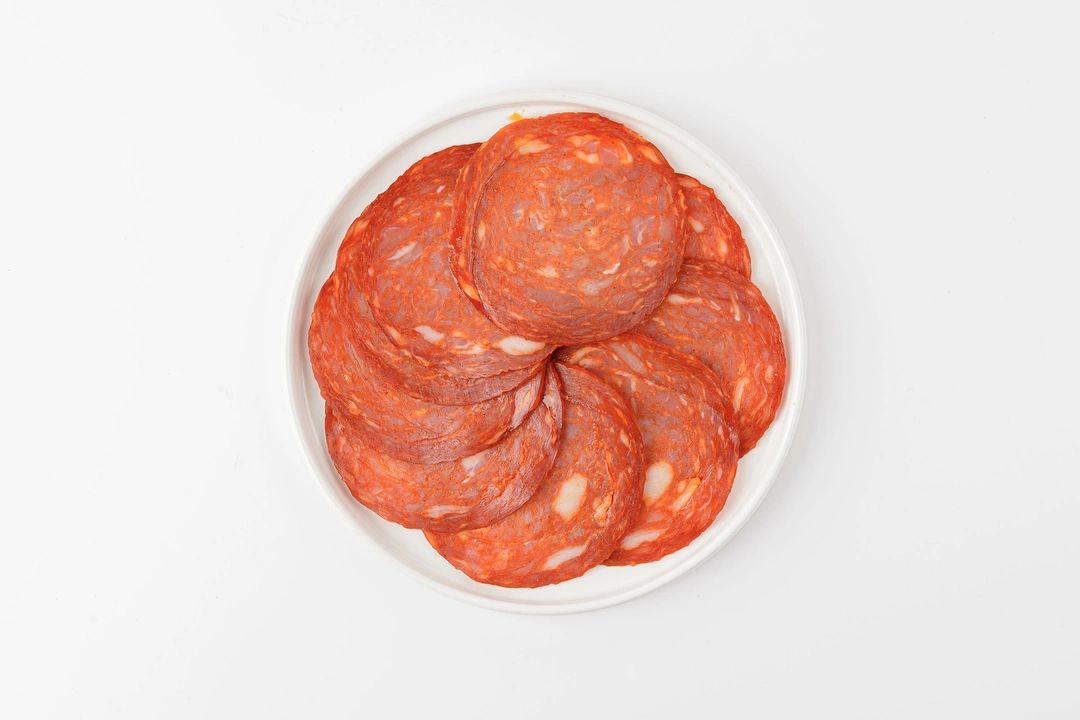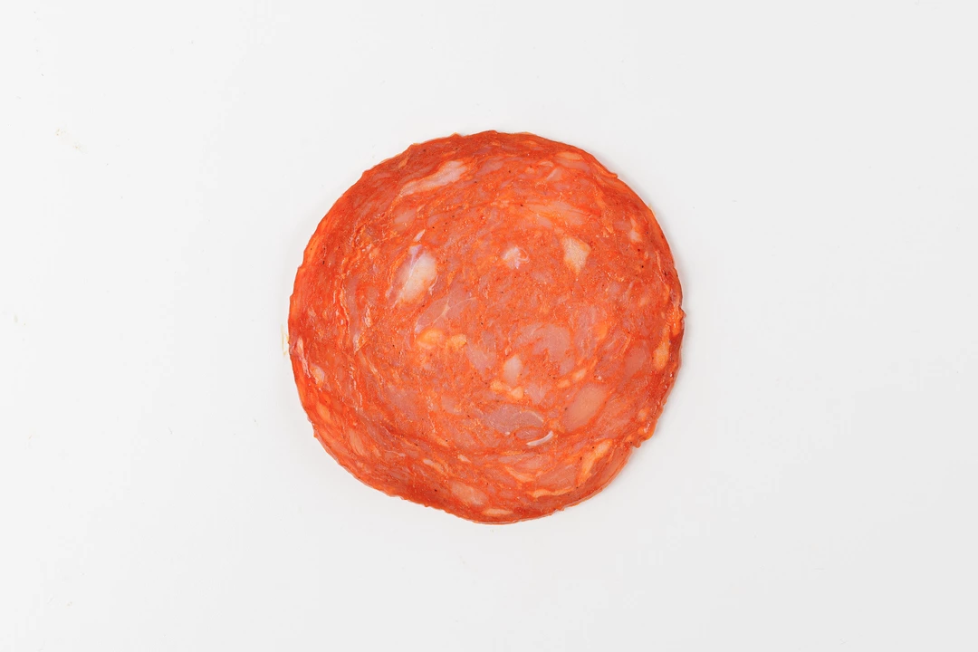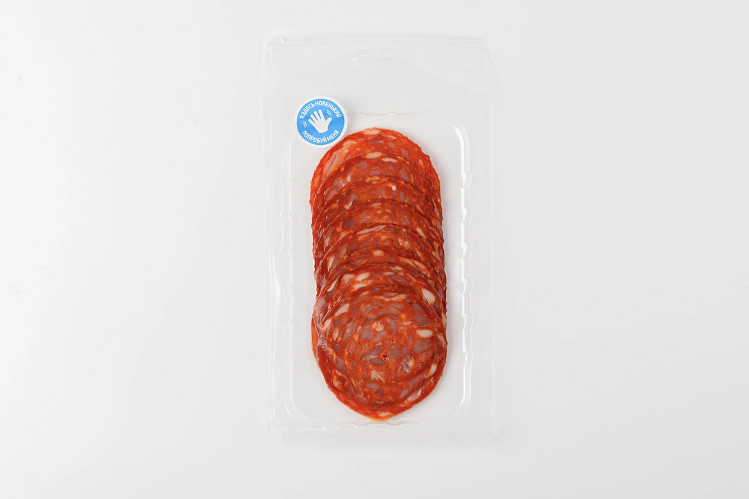 Тонкие ломтики чоризо отличаются характерным вкусом с лёгкой пряной остринкой и ароматом чеснока. В составе — свинина и куриная грудка, благодаря чему текстура получается плотной, но не тяжёлой. Такая нарезка подойдёт для бутербродов, закусочных тарелок, а ещё — в качестве пикантного акцента в салатах и пицце.