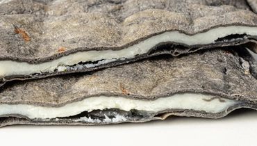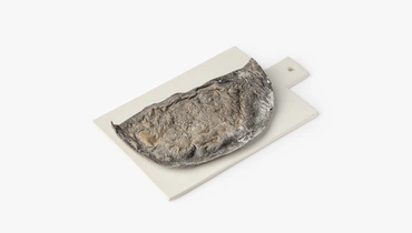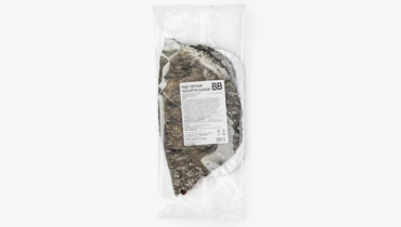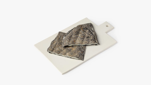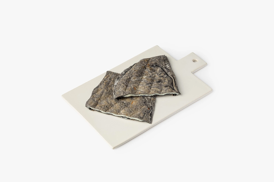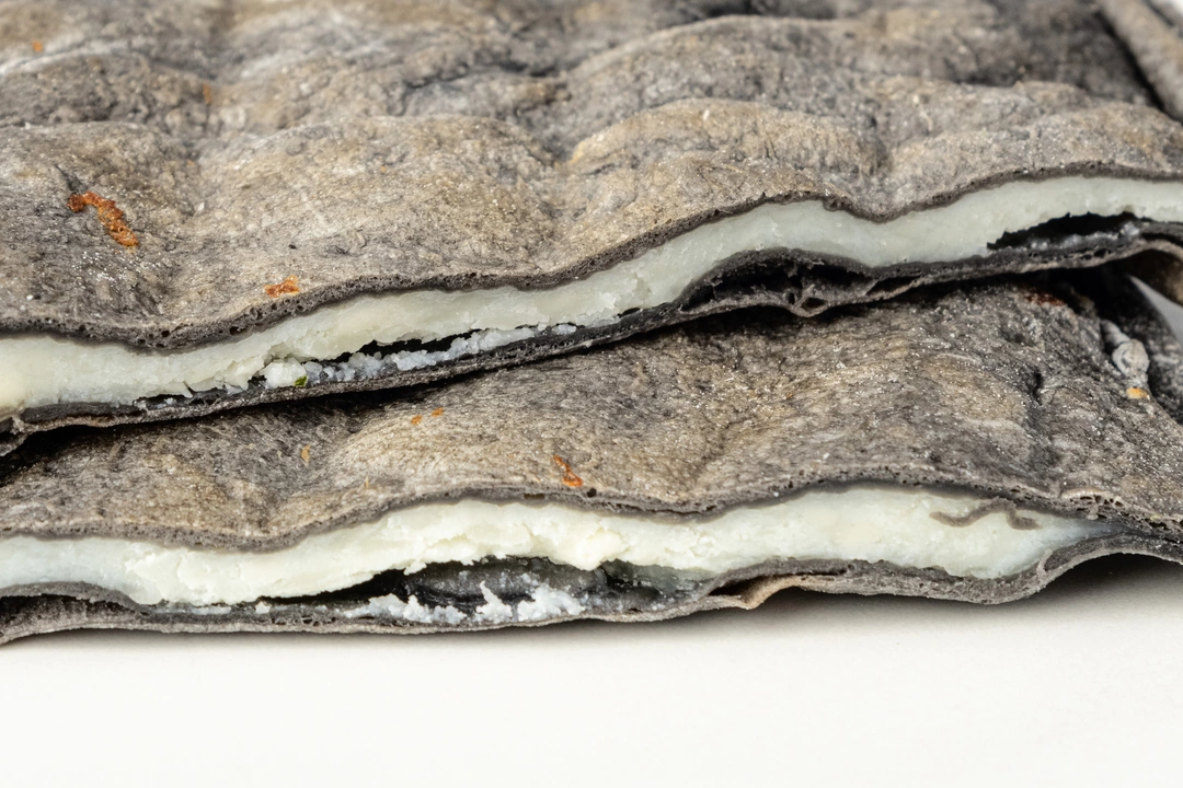 Традиционная дагестанская лепёшка выпечена из теста на кефире с добавлением растительного угля для цвета. Начинка из сырного ассорти: моцареллы, брынзы, сулугуни и рикотты.
