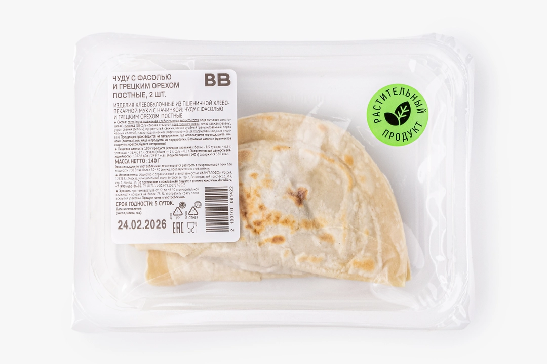 Чуду — это тонкие лепёшки из пресного теста с начинкой. Внутри — фасоль с грецким орехом, луком и зеленью. Приготовлены без ингредиентов животного происхождения. В упаковке 2 лепёшки.
