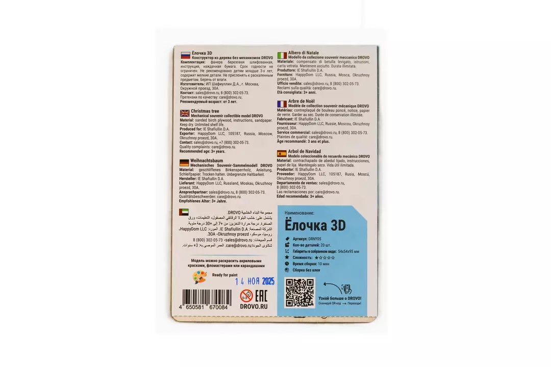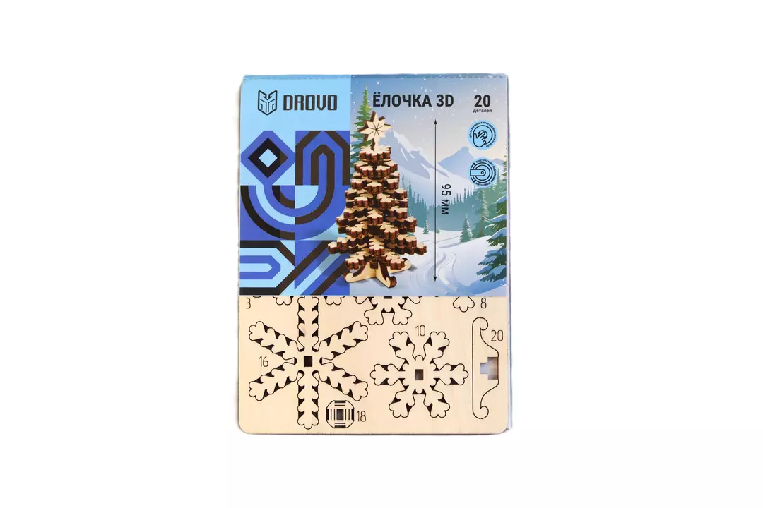 Деревянный конструктор DROVO «Ёлочка 3D маленькая» — это очаровательный новогодний набор для детей и взрослых. Из 20 аккуратно вырезанных деталей вы собираете миниатюрную объёмную ёлочку размером 50×50×75 мм. Компактная и изящная, она станет стильным украшением праздничного интерьера или оригинальным подарком к Новому году и Рождеству. Сборка проходит легко и приятно: детали из натуральной берёзовой фанеры точно соединяются без клея и инструментов. Размер собранной модели: 50x50x75 мм. Количество деталей: 20 шт Россия