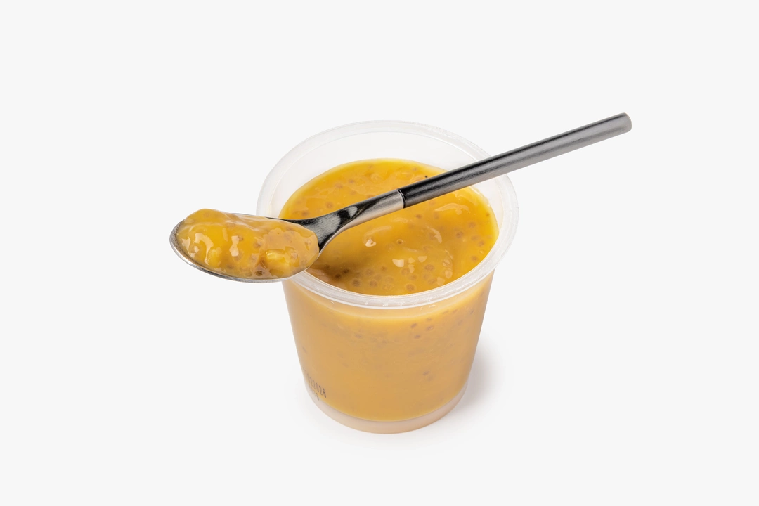 Этот десерт сочетает тропические фрукты с семенами чиа. Банановое и манговое пюре дают нежную основу, ананас добавляет сочность, а маракуйя — лёгкую кислинку и яркий аромат. Семена чиа мы добавили для приятной зернистой текстуры. Подходит в качестве самостоятельного десерта или добавки к йогурту.