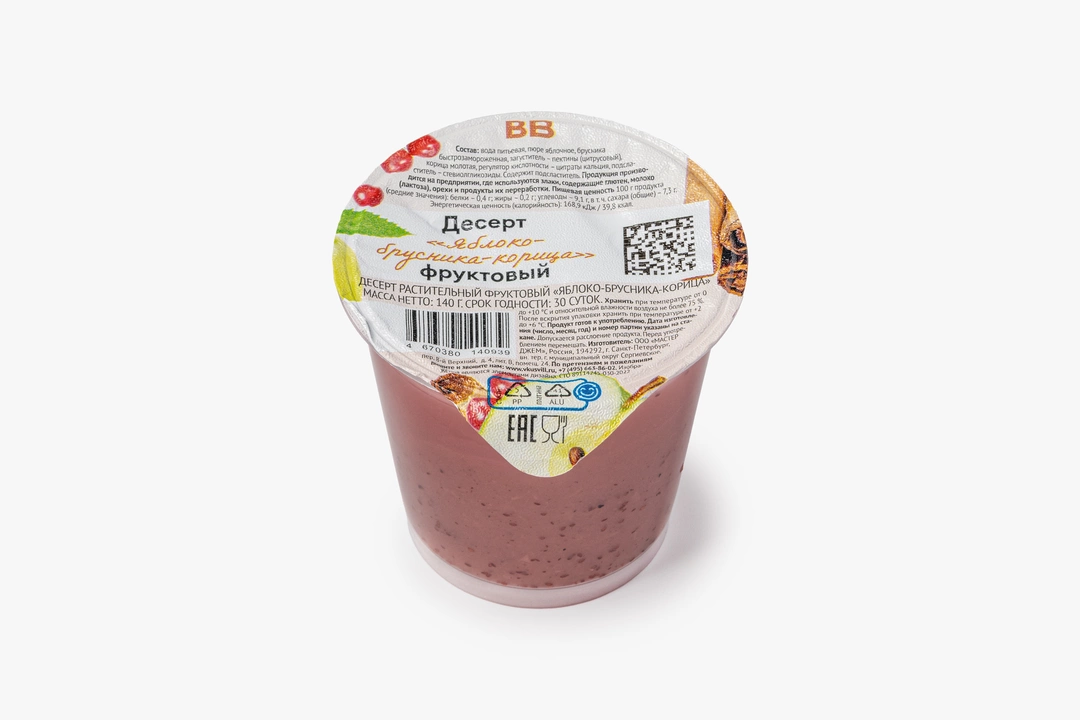 Этот фруктовый десерт сочетает в себе яркую кислинку брусники и яблока с тёплыми нотками корицы. Текстура получается нежной, а корица придаёт пряный оттенок. Для мягкой сладости используем стевию — рафинированного сахара в составе нет. Подходит в качестве самостоятельного десерта или добавки к йогурту.