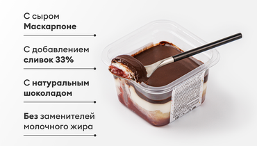 Нежный сливочно-сырный крем на воздушном бисквите под тонким слоем натурального тёмного шоколада. Лёгкую кислинку десерту придает пюре из натуральных ягод клубники