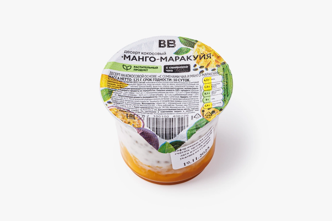 Нежнейший веганский десерт, изготовленный из кокосовой мякоти с добавлением чиа, пюре манго и сока маракуйи. Обладает мягким молочным вкусом, в котором богато раскрываются сочные ноты тропических фруктов. Десерт прекрасно подходит для питательных завтраков и лёгких перекусов.