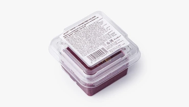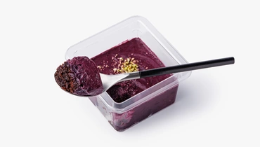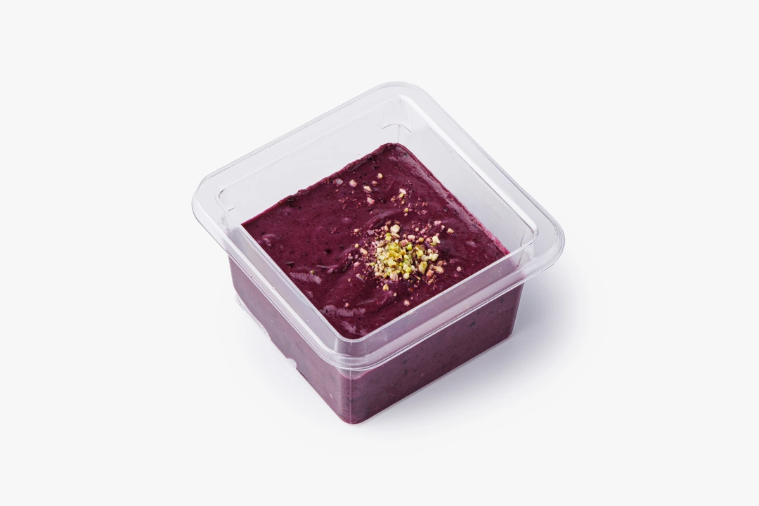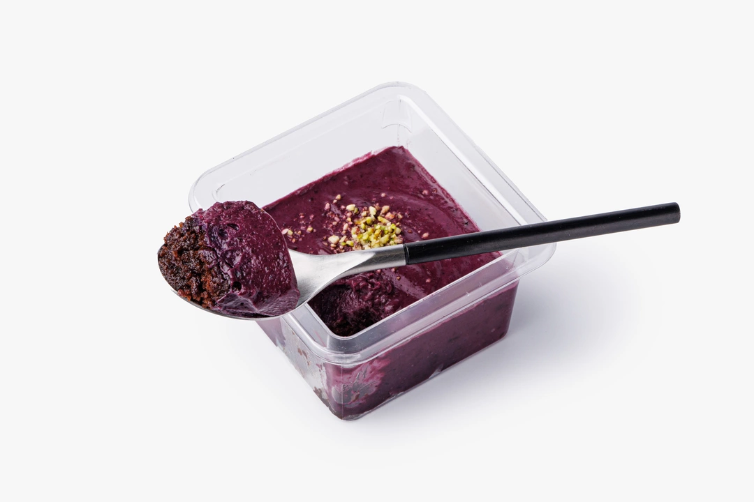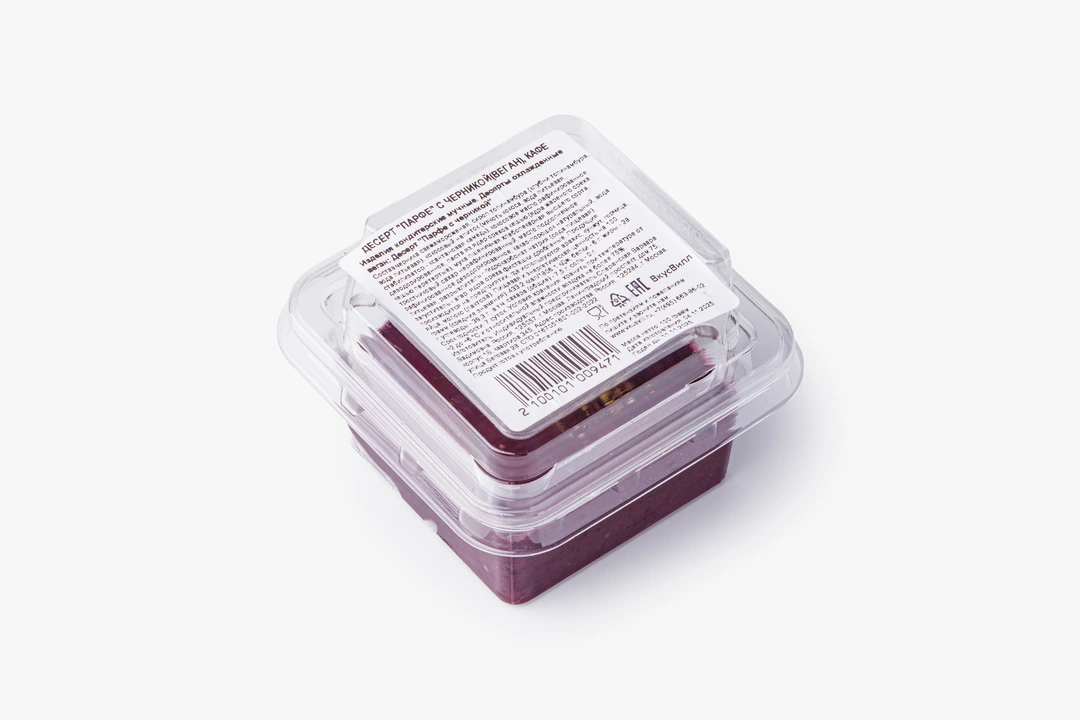 Десерт из черничного пюре с кокосовым напитком и орехами кешью. Имеет густую текстуру, украшен дроблёной фисташкой. Не содержит продуктов животного происхождения.