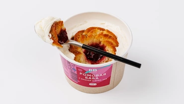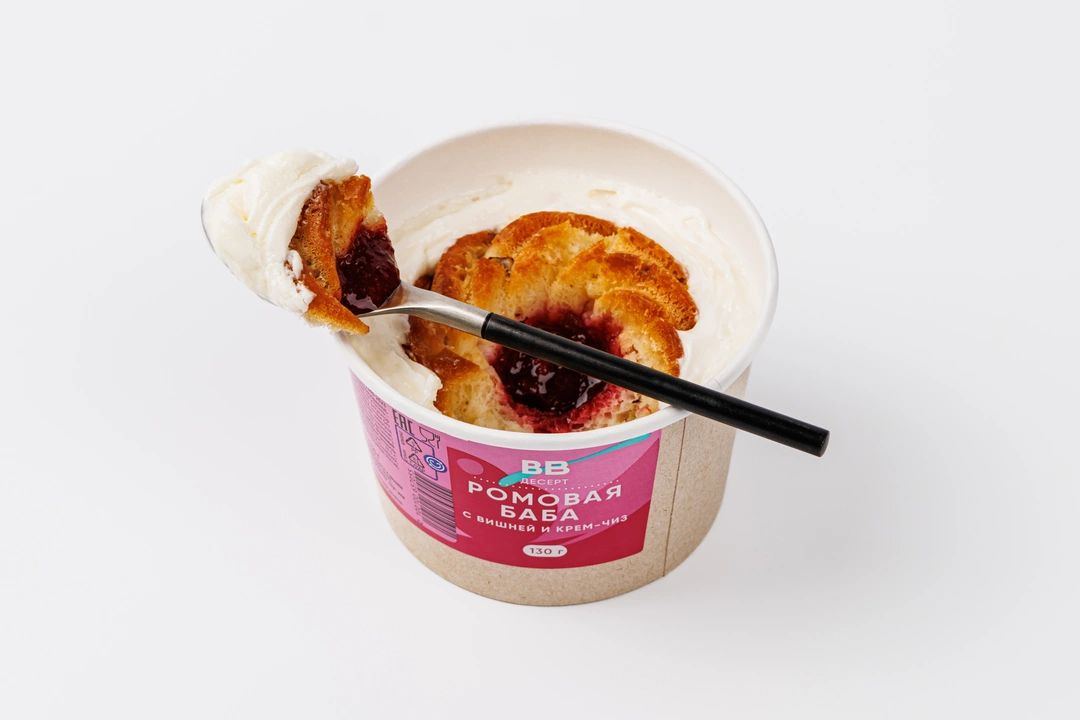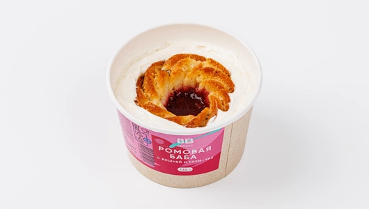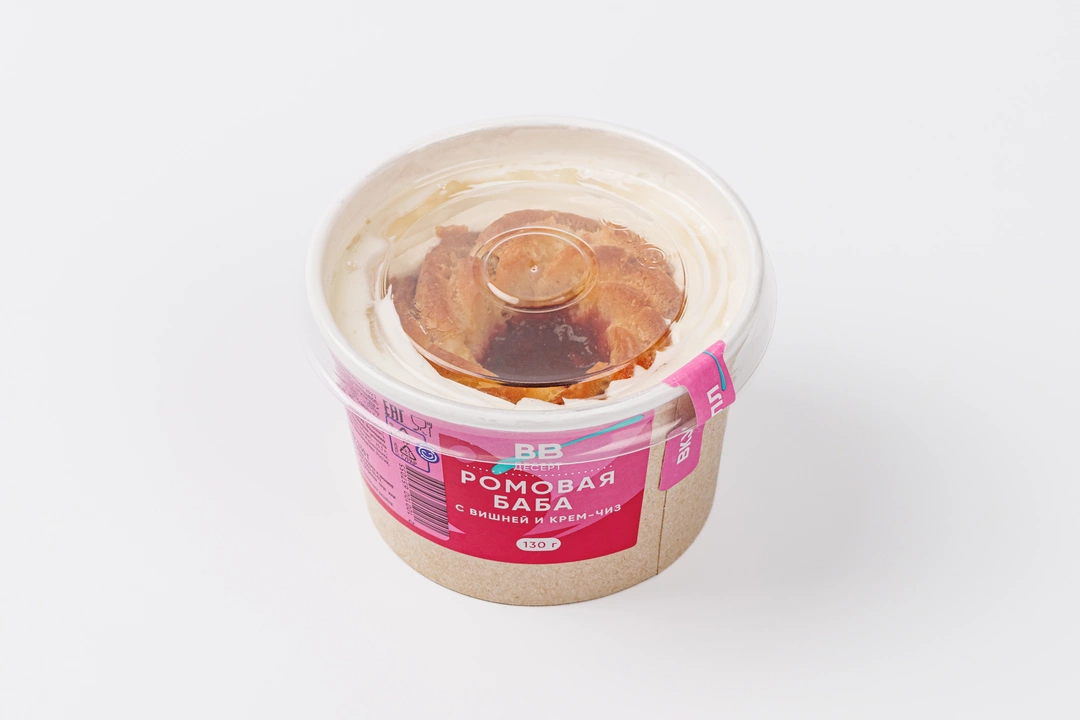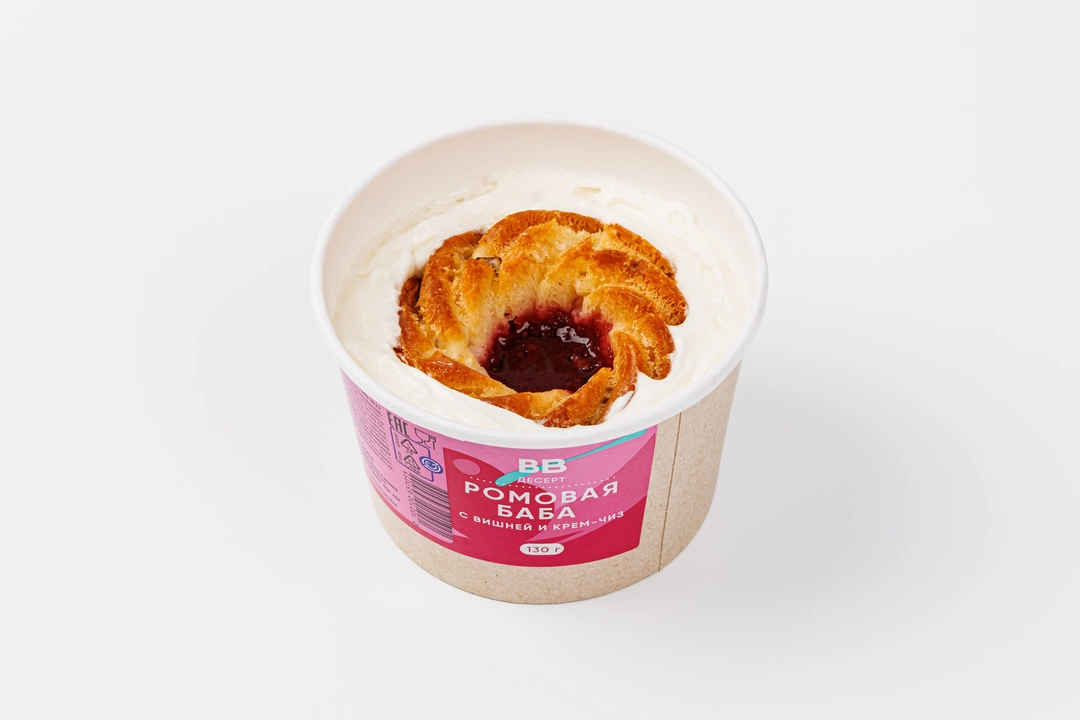 Бисквитный десерт со творожным сыром и спелой вишней. Вкус десерта покоряет звучание сливочно-ягодных нот, которые органично дополняют нежный вкус теста. Ромовая баба в таком оригинальном исполнении замечательно дополнит как повседневное, так и изысканное чаепитие. А удобная упаковка позволит взять её с собой, чтобы полакомиться на прогулке или в дороге.
