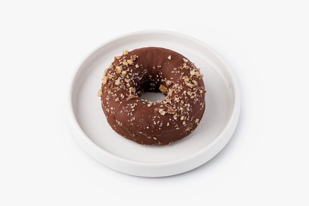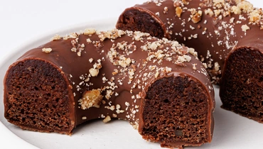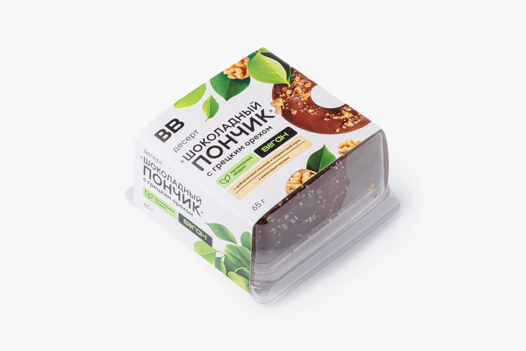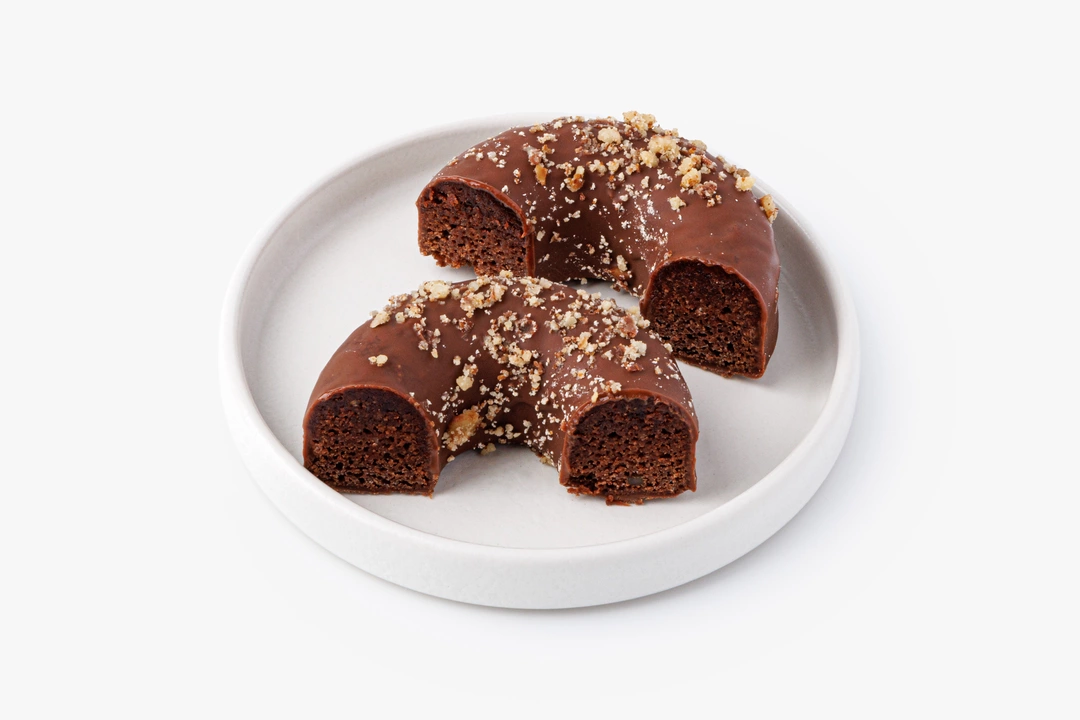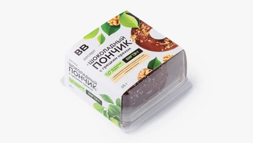 Шоколадный десерт на растительной основе с мягкой текстурой и выраженным вкусом какао. В тесте — смесь безглютеновых видов муки и кусочки грецкого ореха. Покрыт глазурью с добавлением тростникового сахара.