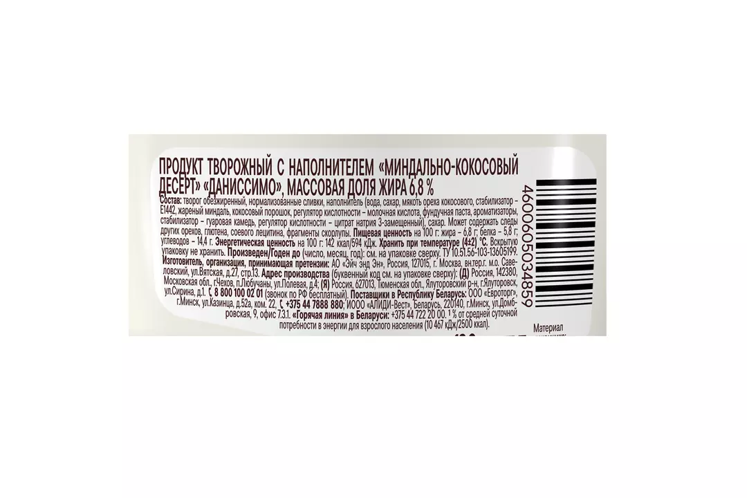 Новый творожный десерт Даниссимо миндально-кокосовый десерт - это идеальное сочетание невероятно сливочной текстуры творожка фундучной основой с кусочками миндаля и коксовой стружкой. Насладись Даниссимо, и пусть весь мир подождет! Страна-производитель Россия