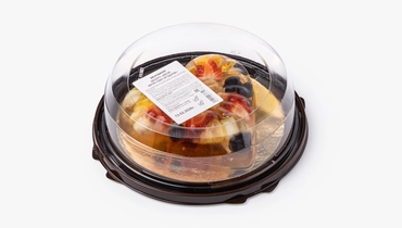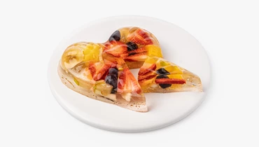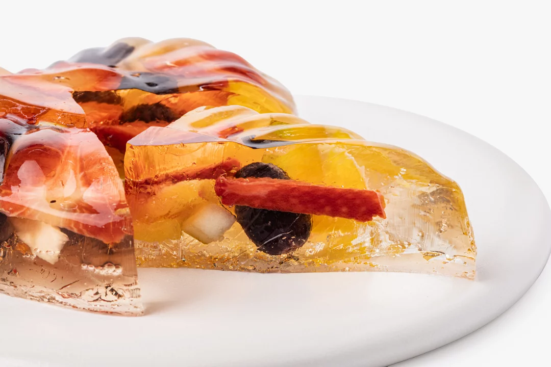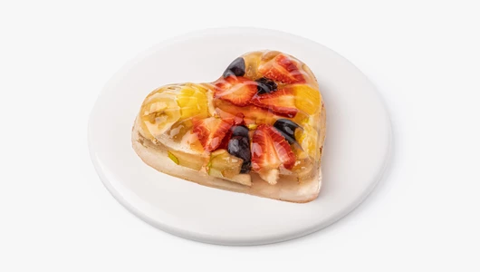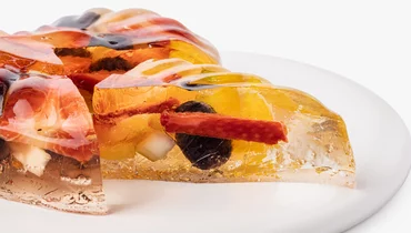 Десерт из натурального прозрачного желе с кусочками свежих фруктов и ягод. В составе — клубника, банан, апельсин, груша, ананас и виноград.