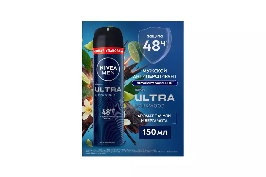 Дезодорант-антиперспирант спрей NIVEA MEN ULTRA DARKWOOD с антибактериальным эффектом** препятствует размножению бактерий, вызывающих неприятный запах. Уникальная в ассортименте бренда формула с черным углем эффективно действует: защищает от пота, сохраняет подмышки сухими и, таким образом, предотвращает неприятный запах тела. Антиперспирант обеспечивает надежную 48-часовую* защиту от пота и запаха, заботясь о вашей коже. Стойкий свежий древесный аромат создан специально для мужчин. Забота о коже от NIVEA MEN на каждый день! Дерматологически протестировано. Способ применения: хорошо встряхнуть перед использованием. Распылять в области подмышек с расстояния 15 см. на чистую и сухую кожу. Дать полностью высохнуть во избежание образования пятен. Не наносить на поврежденную или раздраженную кожу. • Не менее 48 часов защиты*; • Антибактериальный эффект**; • Надёжная защита от пота и запаха; • Для всех типов кожи; • Дерматологически протестировано.