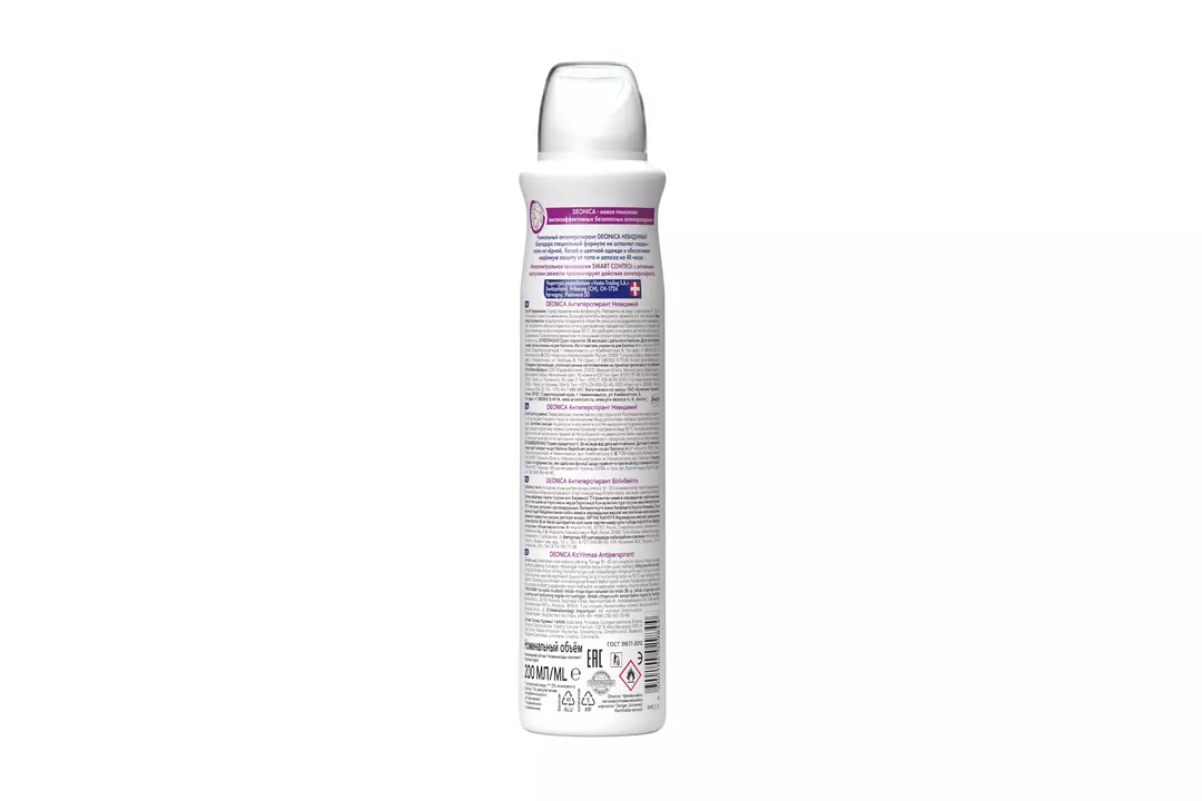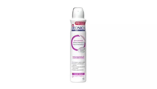 Современный антиперспирант Deonica Невидимый благодаря специальной формуле не оставляет следов и пятен на черной, белой и цветной одежде и обеспечивает надежную защиту от пота и запаха на 48 часов. Интеллектуальная технология Smart Соntrol с активными капсулами свежести пролонгирует действие антиперспиранта. Не оставляет следов на белой, черной и цветной одежде.