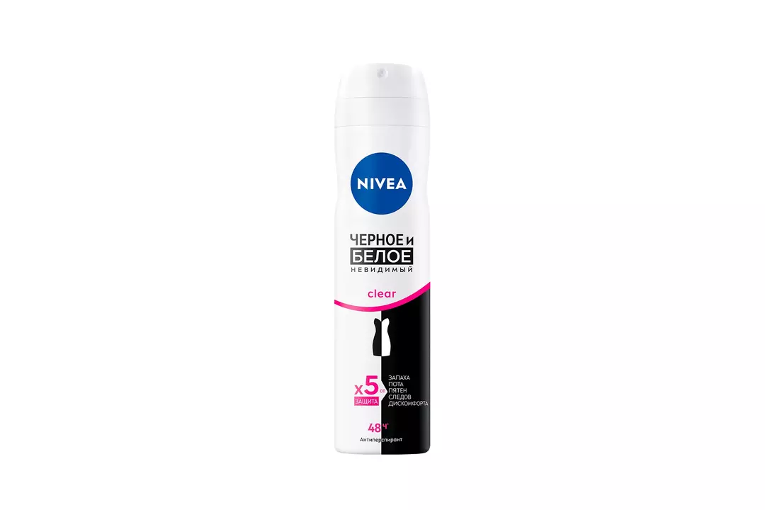 внимание! Смена состава Дезодорант-антиперспирант спрей NIVEA Черное и Белое Невидимый Clear предотвращает появление белых пятен на темной одежде и желтых пятен на светлой одежде. Черная одежда остается черной, а белая одежда дольше остается белой. Уникальная формула имеет 5 факторов защиты: от запаха, пота, пятен, следов и раздражения. Защищает кожу подмышек в течение 48 часов от пота и неприятного запаха. Действует даже в стрессовых ситуациях или на занятиях спортом. Этот чистый, кристальный и яркий сладковатый аромат - выражение естественной женственности. Не содержит этилового спирта. Применение: хорошо встряхнуть перед использованием. Распылять в области подмышек с расстояния 15-20 см. Дать полностью высохнуть во избежание образования пятен на одежде.