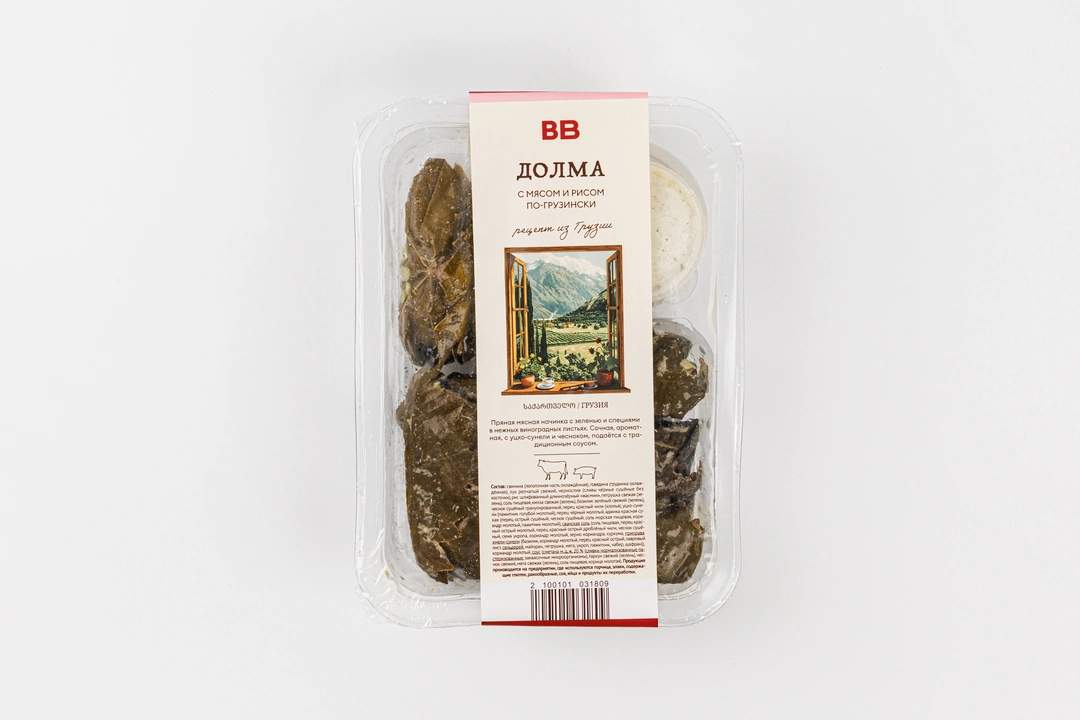 Пряная свино-говяжья начинка с длиннозёрным рисом в нежных виноградных листьях. Мы добавили в мясо чернослив, зелень и душистые приправы, чтобы оно стало ароматным и пикантным. Долма подаётся с традиционным грузинским соусом на основе сметаны с добавлением чеснока, мяты и тархуна. Особенно вкусно есть её горячей, когда листья становятся мягкими, а букет специй раскрывается полнее. Предложите к ней свежие овощи и пышные лепёшки, чтобы создать атмосферу щедрого кавказского застолья с его изобилием и яркой подачей блюд.