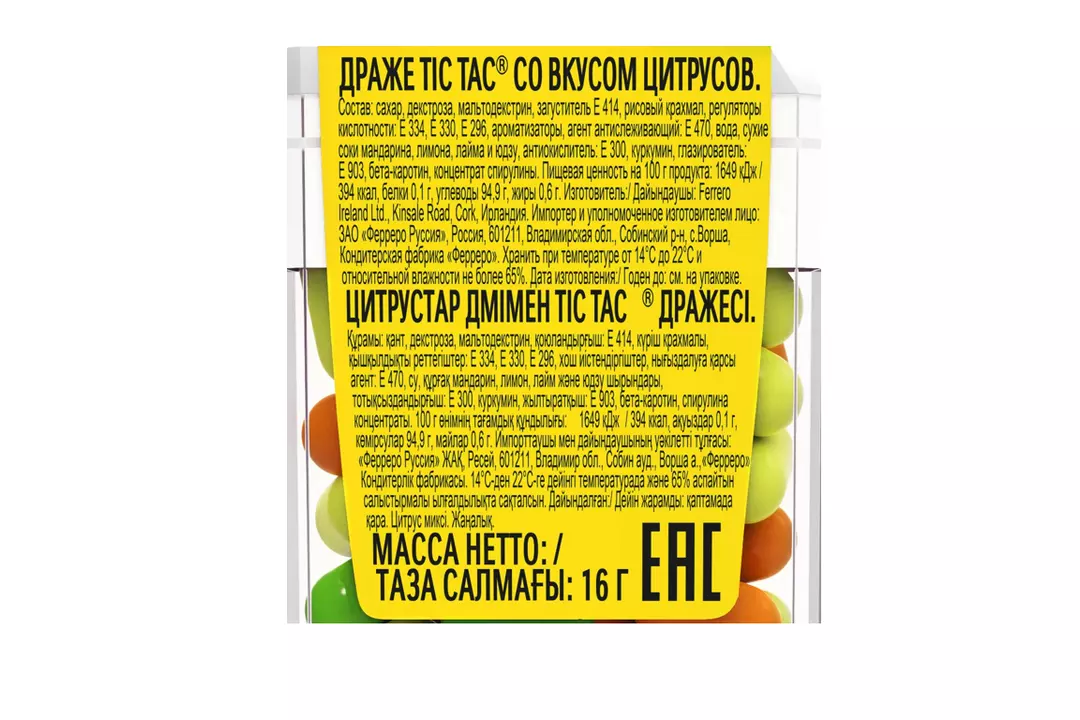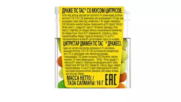 Tic Tac® — освежающие драже для мягкого освежения. В каждом драже более 100 слоёв уникального вкуса. Tic Tac® Цитрусовый микс со вкусом мандарина, лимона, лайма и юдзу — созвучно дополняют друг друга и пробуждают целый микс эмоций. Хранить при температуре от 14°C до 22°C и относительной влажности не более 65%. Страна производитель-ИРЛАНДИЯ