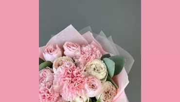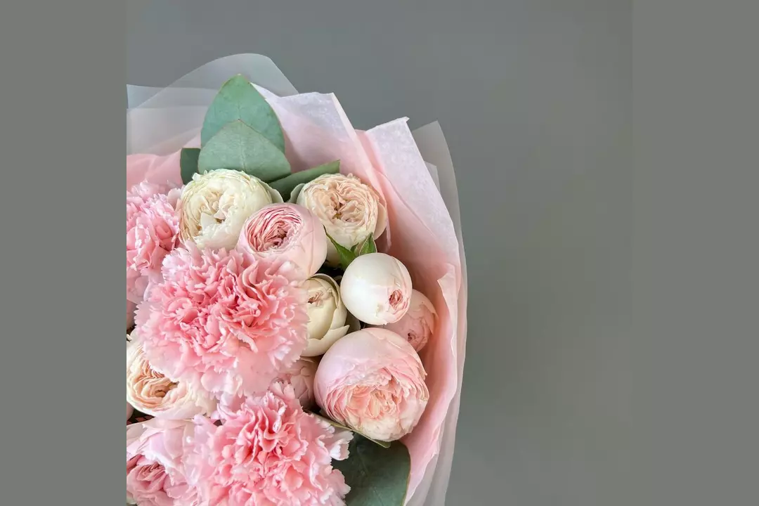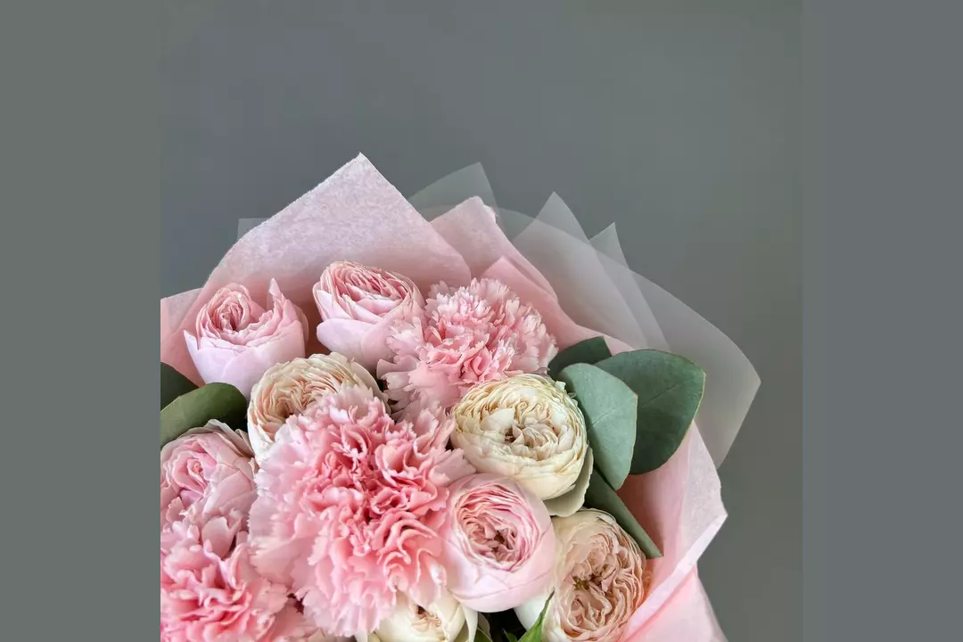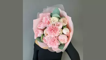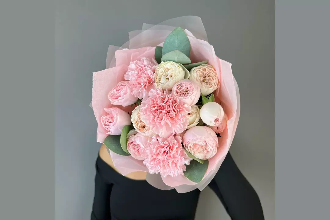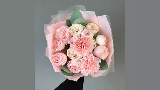 Эвкалипт - 1 шт. Гвоздика - 3 шт. Роза кустовая пионовидная - 5 шт. Упаковка дизайнерская - 1 шт.