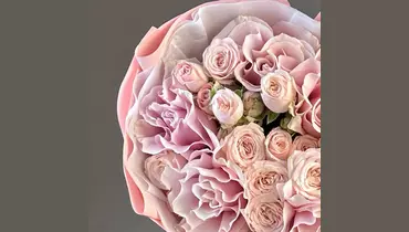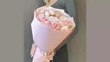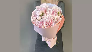 Роза - 5 шт. Лента атласная - 1 шт. Тишью - 2 шт. Роза кустовая пионовидная - 6 шт. Пленка матовая - 3 шт.
