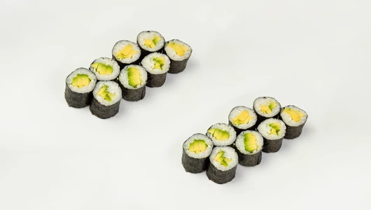 Двойная порция классического легкого ролла в идеальном сочетании риса, нори и авокадо. Подается с соевым соусом, маринованным имбирем, васаби.
