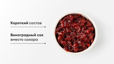 Используем виноградный сок вместо сахара. Короткий и понятный состав: только брусника, виноградный сок, яблочный пектин и лимонная кислота