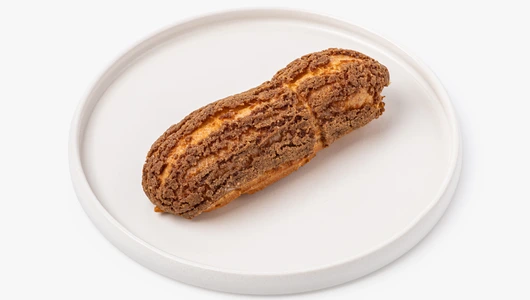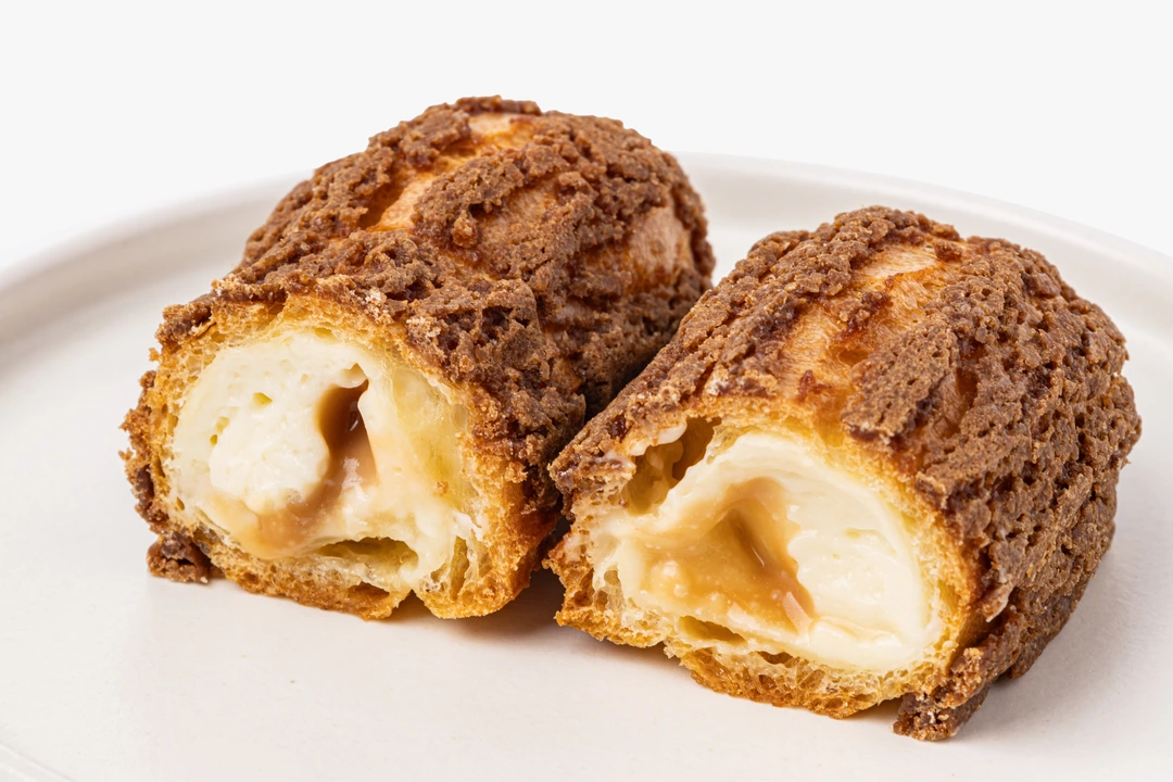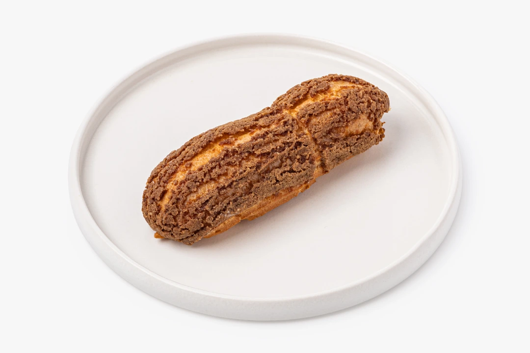 Нежный эклер из заварного теста с хрустящей корочкой кракелюр. Внутри — сливочный заварной крем и солёная карамель на основе сливок и сливочного масла