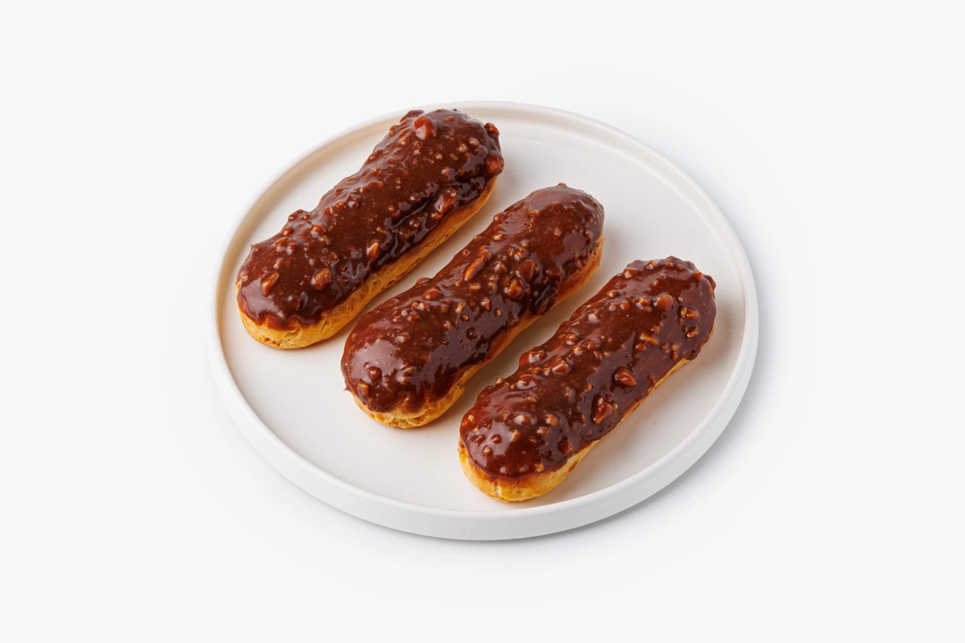 Эклеры из заварного теста с кремом из арахисовой пасты и сливок покрыты шоколадной глазурью с кусочками орехов. В упаковке 3 пирожных.