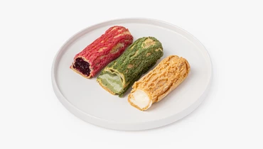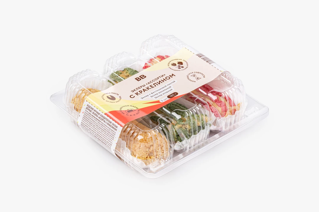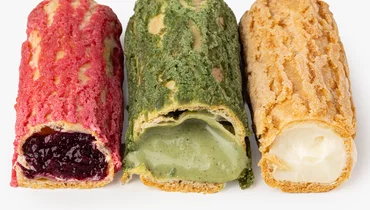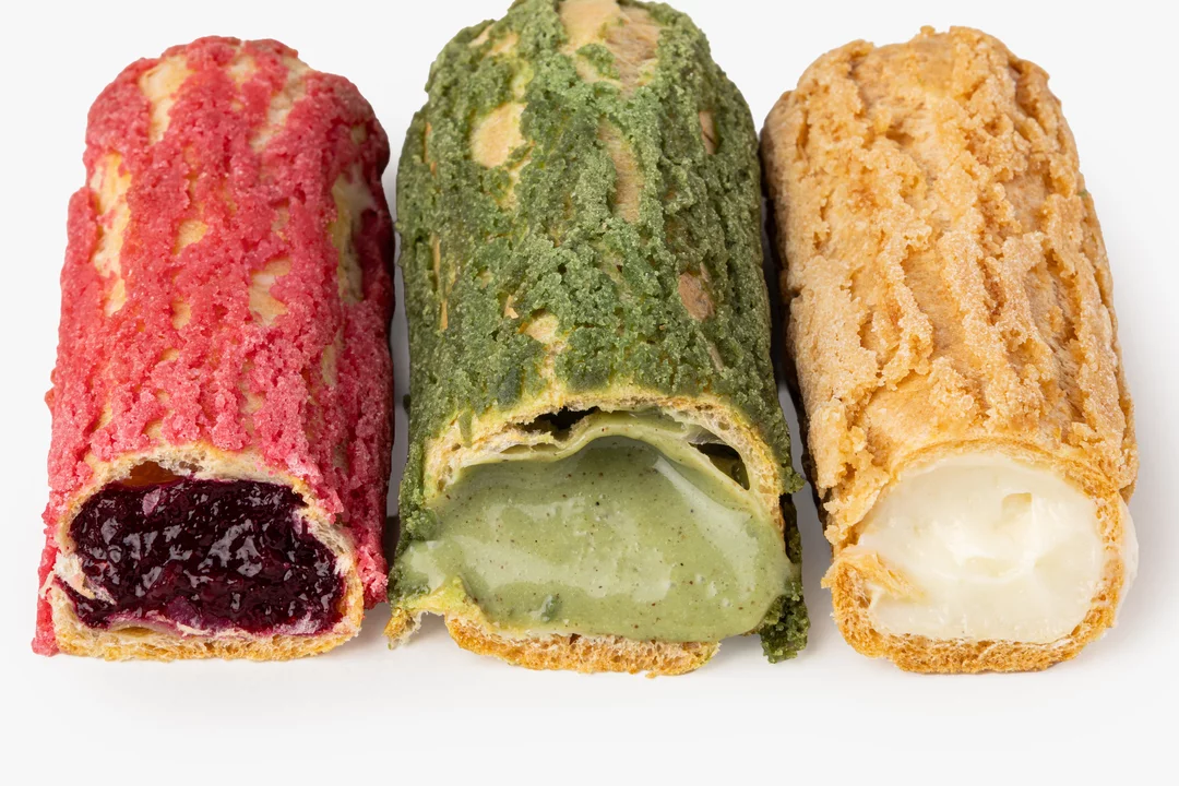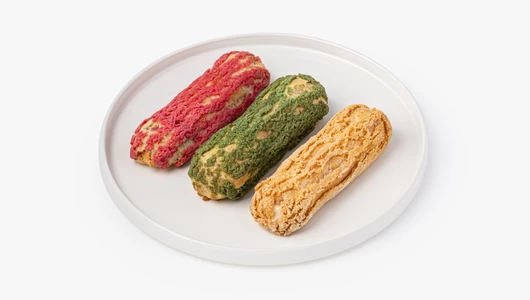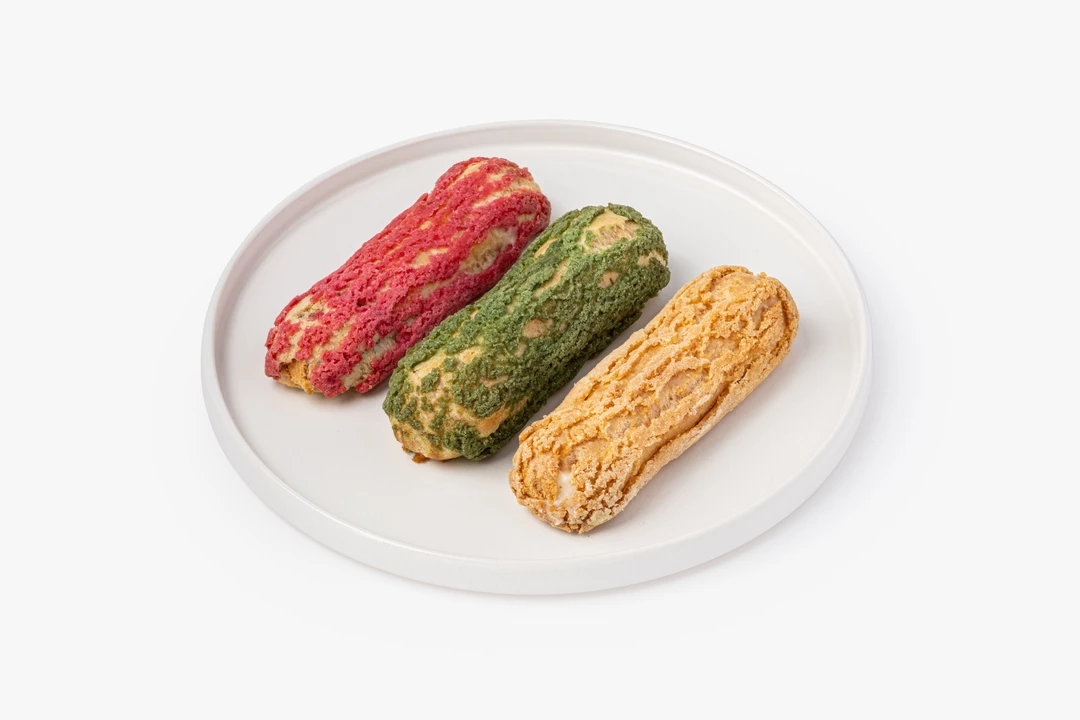 Эклеры с хрустящим кракелином и заварным кремом. В наборе представлены три вида: с ягодным кремом и красным кракелином, с фисташковым кремом и зелёным кракелином, а также с классическим заварным кремом и белым кракелином.