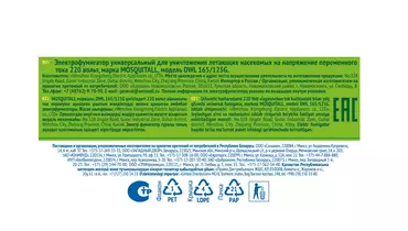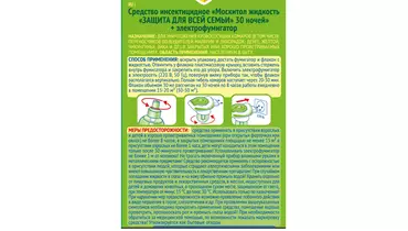 Для детей с 14 лет. Электрофумигатор + жидкость 30 ночей защиты от комаров. Флакон объемом 30 мл рассчитан на 30 ночей по 8 часов работы ежедневно.∙ Эффективно уничтожает комаров даже при открытых окнах ∙ Уникальная конструкция прибора исключает контакт нагревательного элемента с руками ∙ Универсальный фумигатор: можно использовать как с пластинами, так и с жидкостью ∙ Индикатор работы – диод ∙ Вилка подвижна и позволяет устанавливать фумигатор даже в неудобно расположенные розетки ∙ Гарантия пожаробезопасности прибора ∙ Полное уничтожение комаров достигается через 20-30 минут ∙ Инновационный керамический нагревательный элемент поддерживает постоянную температуру прибора, обеспечивая защиту от комаров на протяжении всей ночи. Страна производитель-Россия