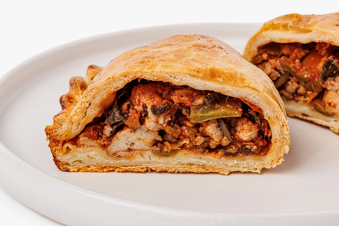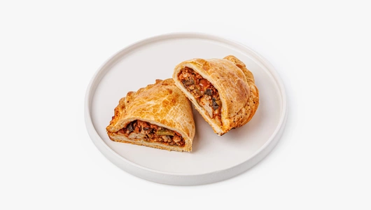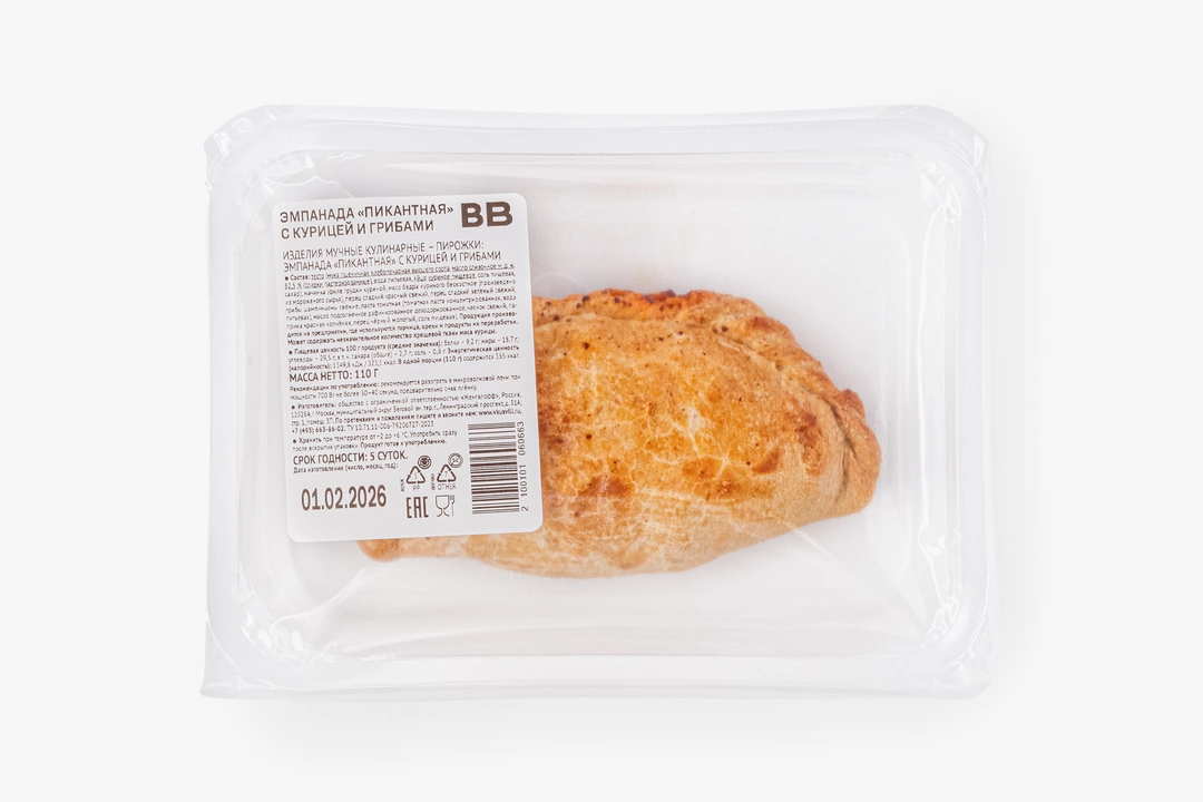 Традиционный испанский пирожок с сытной начинкой. Внутри аппетитное куриное мясо с шампиньонами, овощами и букетом специй, придающих выпечке лёгкую пикантность.