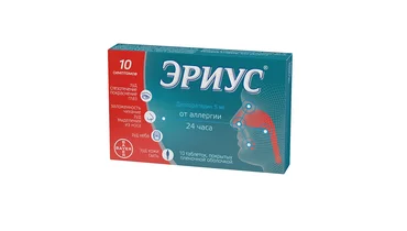 Эриус - Таблетки от аллергии, действующее вещество дезлоратадин. Ищете средство от аллергии? Эриус в таблетках - это препарат последнего поколения, c тройной активностью против аллергии: противовоспалительной, антигистаминной и противоаллергической*. Эриус способствует устранению 10 симптомов аллергии: - Зуд, покраснение и слезотечение глаз; - Заложенность, чихание, зуд и выделения из носа; - Зуд неба; - Зуд кожи, сыпь. Препарат показан: - при сезонном и круглогодичном аллергическом рините; - при крапивнице. В отличие от некоторых других антигистаминных препаратов II поколения* Эриус не взаимодействует с лекарственными средствами и алкоголем*, не вызывает сонливость (возможная частота менее 1 на 10 000 пациентов). Препарат принимается 1 раз в сутки, способен начать действовать в течение 30 минут после приема и оказывать эффект в течение 24 часов. Взрослым и подросткам от 12 лет по 1 таблетке (5 мг) 1 раз в сутки. Теперь в новой упаковке. *Canonica GW., Blaiss M. Antihistaminic, anti-inflammatory, and antiallergic properties of the nonsedating second-generation antihistamine desloratadine: a review of the evidence. World Allergy Organ J. 2011 Feb;4(2):47-53; Например, при совместном применении фексофенадина с эритромицином или кетоконазолом концентрация фексофенадина в плазме увеличивается, алюминий- или магний содержащие антациды снижают биодоступность фексофенадина (инструкция по применению препарата Аллегра); одновременное применение цетиризина с алкоголем или препаратами, угнетающими ЦНС, может способствовать дальнейшему снижению концентрации внимания и быстроты реакций (инструкция по применению препарата Зиртек); Одновременно с алкоголем следует применять с осторожностью. Круглые двояковыпуклые таблетки голубого цвета. С одной стороны таблетки имеется небольшое углубление в центре, другая сторона гладкая. Форма выпуска: Таблетки, покрытые пленочной оболочкой, 5 мг. По 10 таблеток в блистер из ПВХ/ ПХТФЭ/Al фольги. 2 блистера вместе с инструкцией по применению в картонную пачку с контролем первого вскрытия.