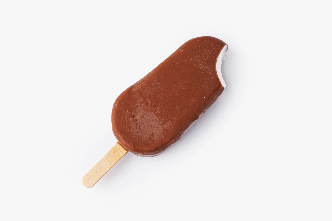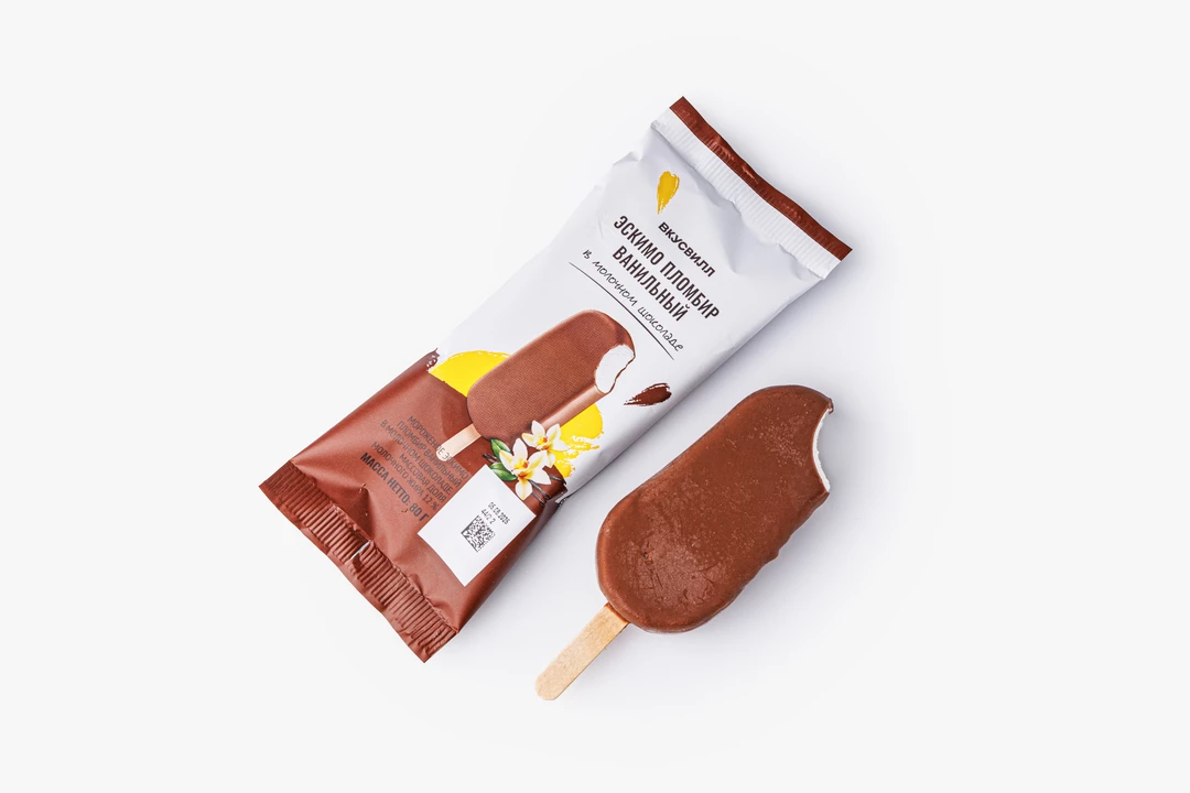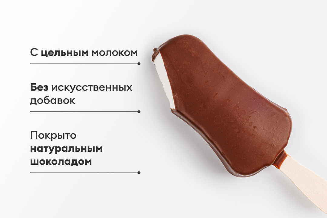 Пломбир из цельного и сгущённого молока, покрытый молочным шоколадом. Состав проверен: нет искусственных ароматизаторов и красителей