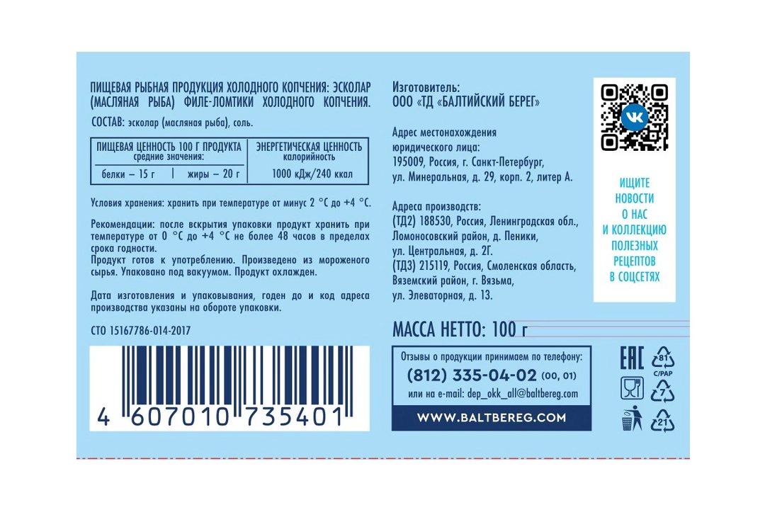 Эсколар (масляная рыба) филе-ломтики Балтийский берег холодного копчения в/у 100 г / Супермаркет