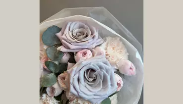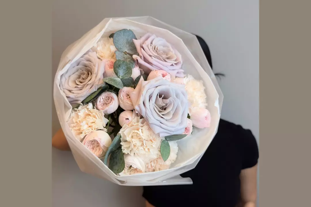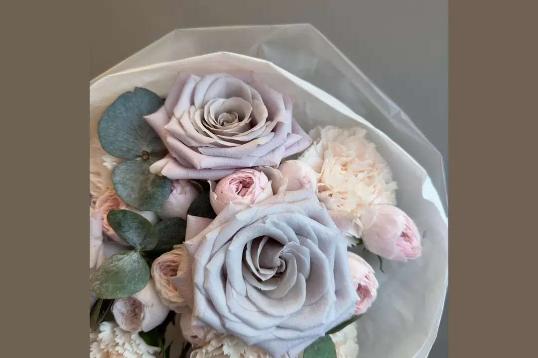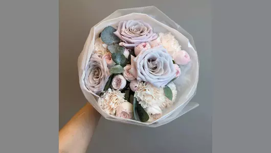 Эвкалипт - 1 шт. Диантус - 5 шт. Роза кустовая пионовидная - 3 шт. Упаковка дизайнерская - 1 шт. Мента - 3 шт.