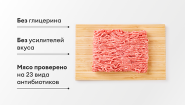 Для приготовления фарша используем только качественное мясо — дополнительно проверяем его на 23 вида антибиотиков. Не добавляем искусственные ароматизаторы, усилители вкуса или глицерин