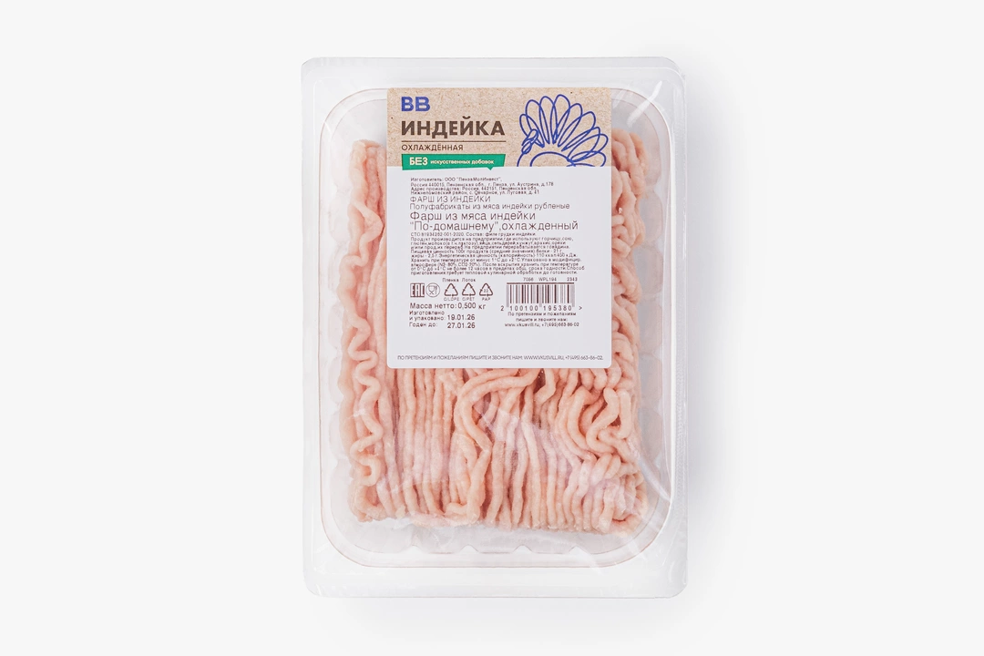 Нежный фарш не содержит консервантов и ароматизаторов. Проверяем индейку на 23 вида антибиотиков. Подходит для детского и диетического питания