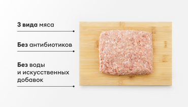Особенно нежный, нежирный фарш из трёх видов мяса. Идеальная основа для легких, но очень питательных диетических блюд. Из такого фарша можно приготовить детские паровые тефтельки с брокколи и сыром, привычные котлеты в панировке или сочный и пряный люля-кебаб.