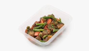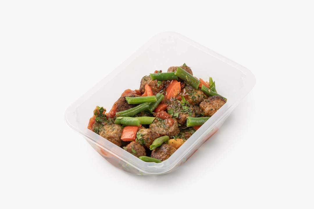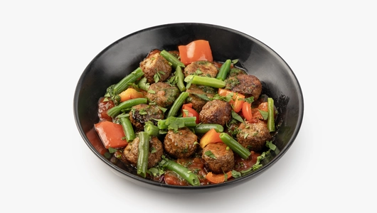 Плотные растительные фрикадельки с ароматом говядины и луком подаются с зелёной стручковой фасолью и печёным сладким перцем. Их дополняет томатный соус с яблочным пюре и пряностями — корицей, душистым перцем и гвоздикой. Соус сальса с томатами, луком и халапеньо добавляет свежую кислинку и лёгкую остроту. Шпинат и петрушка вносят травяные нотки. Блюдо приедет горячим — его можно сразу подавать, пока фрикадельки сохраняют сочность, а овощи пропитываются ароматами соусов.