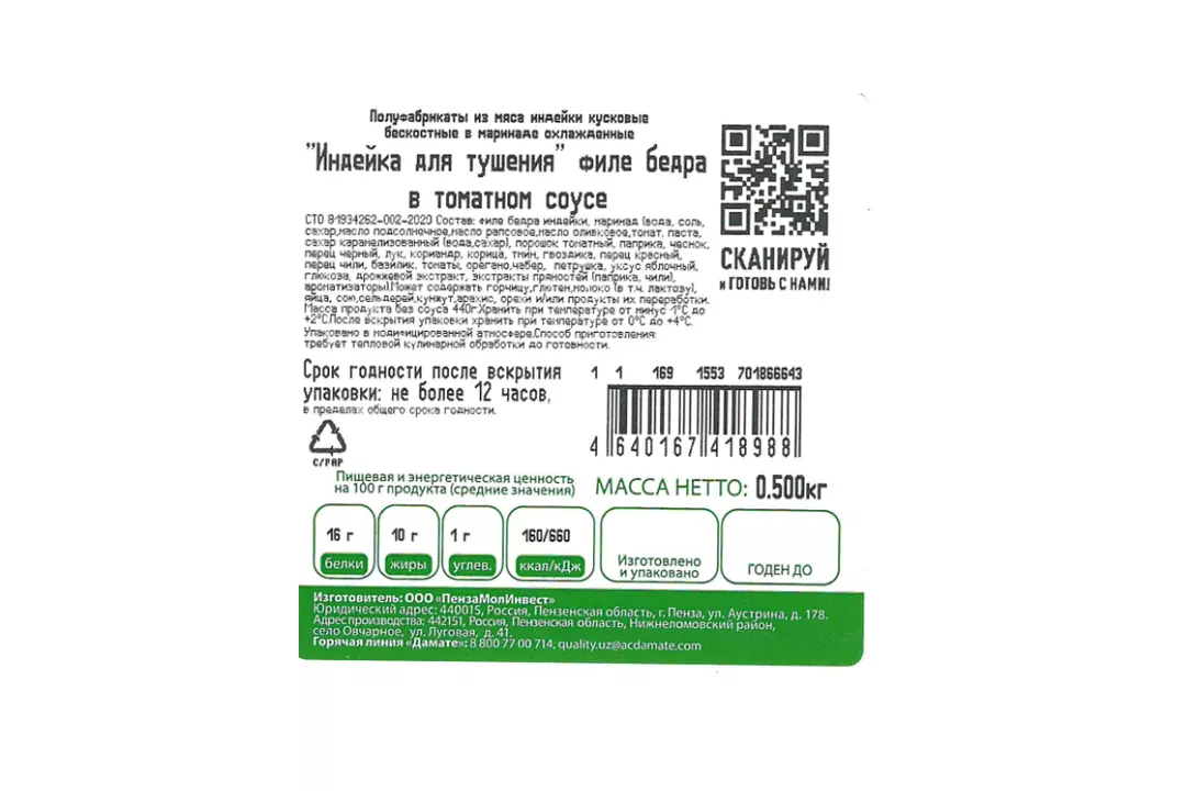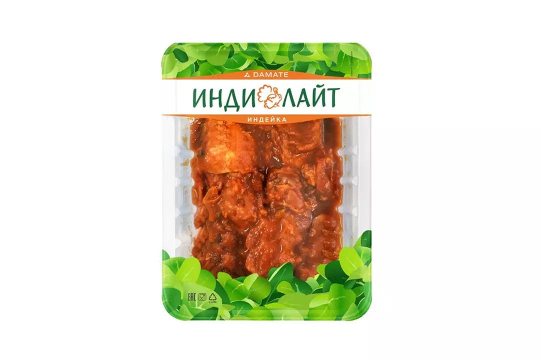 Уже нарезанное филе бедра индейки  в томатном соусе. Осталось только выложить на сковороду, и потушить в течение 15 – 20  минут. И блюдо готово! Страна-производитель Россия