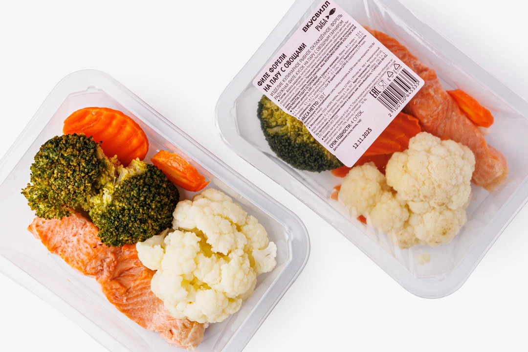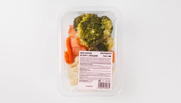 Сбалансированное блюдо для сторонников правильного питания. Ароматная форель с брокколи, цветной капустой и морковью. Рыба и овощи приготовлены на пару и минимально приправлены подсолнечным маслом с солью. Отличный вариант и для обеда, и для ужина. Масса нетто рыбной части блюда - 65 г.