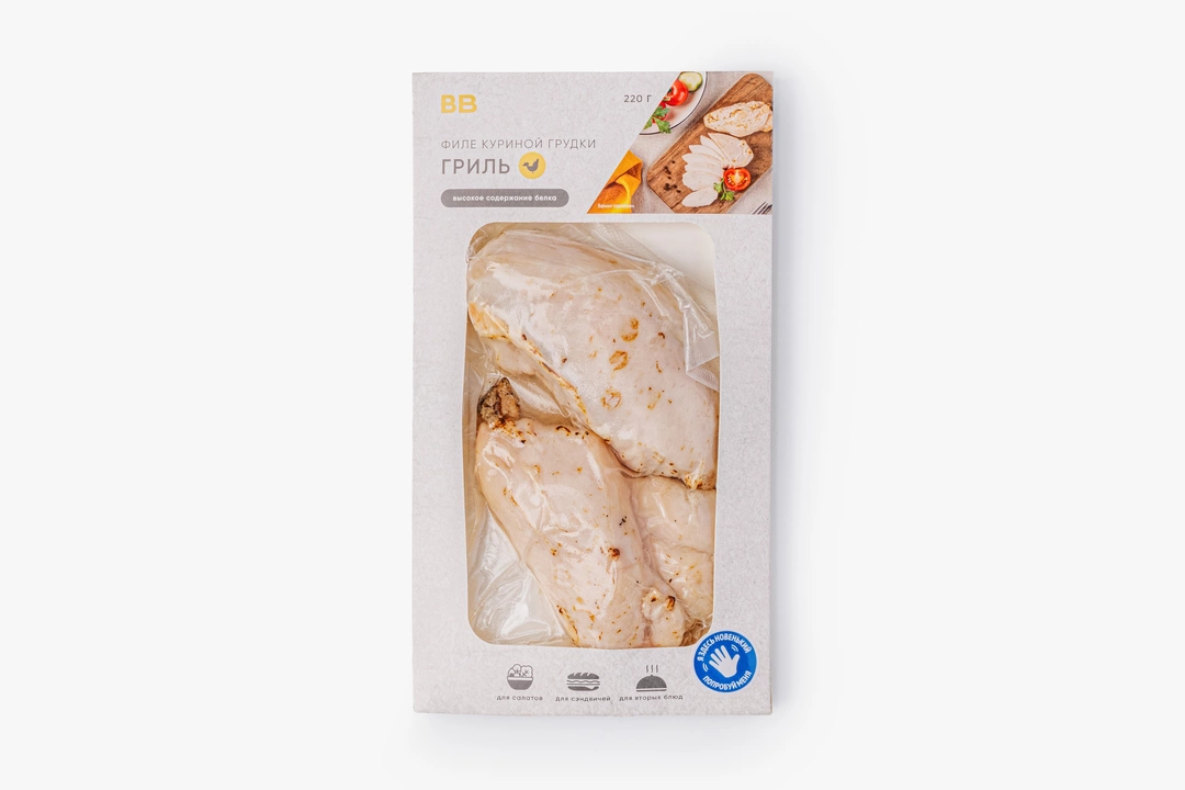 Филе куриной грудки, приготовленное на гриле, отличается сочностью и мягкой текстурой. Подходит для тех, кто ценит чистый вкус без лишних специй: состав дополнен лишь подсолнечным маслом, солью и луковым соком. Его можно подавать с любым гарниром — от свежих овощей до блюд из круп, филе хорошо сочетается с зеленью и лёгкими соусами. Продукт также используют в салатах и сэндвичах. Филе подходит для разных рационов благодаря высокому содержанию белка и минимальному количеству жира.