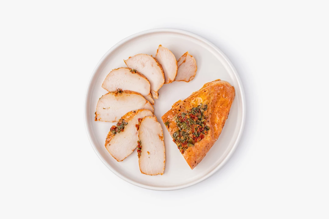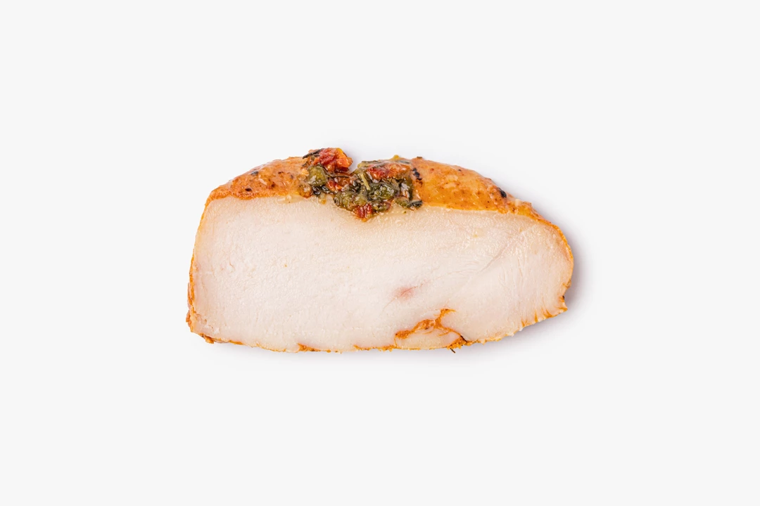 Нежное куриное филе приготовлено по технологии су-вид — мы медленно томили его в вакууме с томатной пастой и кусочками сушёных томатов. Мясо остаётся сочным, а томаты добавляют лёгкую кислинку и яркий овощной акцент. Тимьян и чеснок подчёркивают вкус, а луковый концентрат делает аромат более глубоким. Удобно нарезать грудку ломтиками для салатов и сэндвичей или дополнить гарниром — рисом, овощами, пастой. Такое филе хорошо и само по себе, и в компании: его можно добавить в салат, выложить на хрустящий тост или сделать с ним сэндвич. Разогревать необязательно — достаточно открыть упаковку и подать. Но если хочется горячего, можно ненадолго отправить курочку на сковороду или в микроволновку.