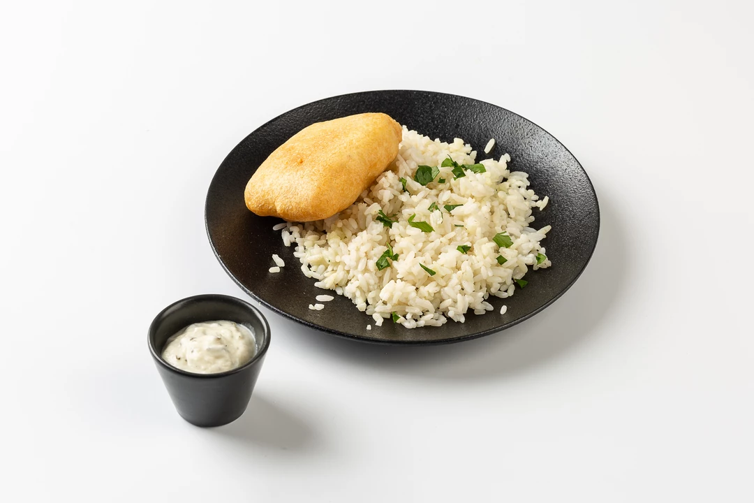 Нежное филе трески в лёгком кляре подаётся с рассыпчатым отварным рисом и сливочно-чесночным соусом — простое и сытное сочетание, где каждый компонент дополняет друг друга. Рыба сохраняет сочность под хрустящей корочкой, а нейтральный рис зазвучит интереснее вместе с соусом, в котором чувствуются ноты свежего чеснока и укропа. Свежая петрушка завершает блюдо ярким акцентом. Оно приедет горячим и будет сразу готово к подаче.