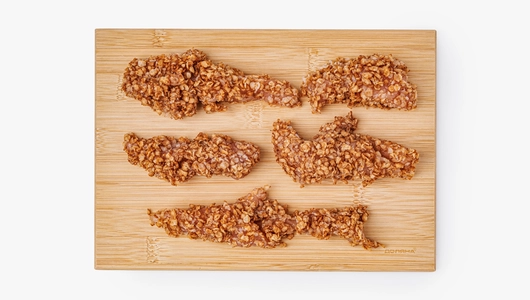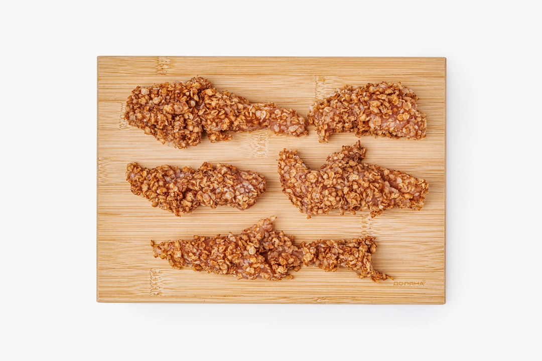 Кусочки куриного филе в панировке из гречневых хлопьев с выразительной текстурой. Хлопья из цельного ядра гречихи дают лёгкий ореховый оттенок, хорошо контрастируя с нежным мясом. При приготовлении панировка подрумянивается, оставаясь аккуратной, а филе сохраняет сочность. Подходит для жарки на сковороде. Это быстрый способ приготовить вкусный и сытный ужин для всей семьи.