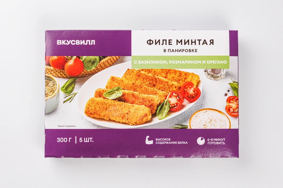 Нежное филе минтая в панировке, которая при тепловой обработке образует румяную корочку и сохраняет рыбу мягкой и сочной. Для этого блюда мы приправили рыбу средиземноморскими травами, чтобы придать ей душистый аромат. Минтай хорош при любом способе приготовления: его можно обжарить на сковороде или запечь в духовке. Подавайте его на стол с любимым соусом, лёгким гарниром или овощным салатом.