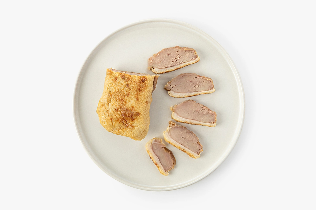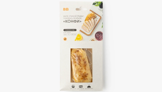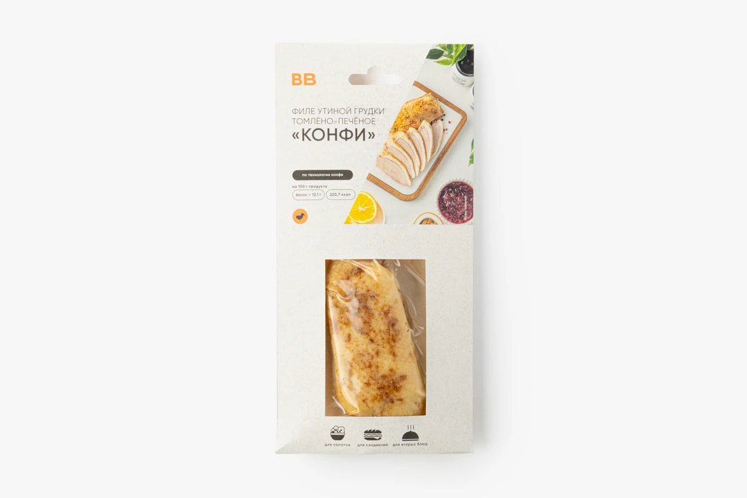 Утиная грудка, приготовленная по технологии конфи, — это готовое блюдо с мягкой, сочной текстурой и насыщенным вкусом. Благодаря медленному томлению в печи мясо остаётся нежным, легко разделяется на волокна и хорошо держит форму при нарезке. В составе — деликатный набор специй: лук, морковь, сельдерей, паприка и куркума. Они добавляют лёгкую пряность и тёплый оттенок. Грудку можно подавать горячей с картофельным пюре, тушёной капустой или запечёнными овощами. А в холодном виде она хороша для сэндвичей и бутербродов