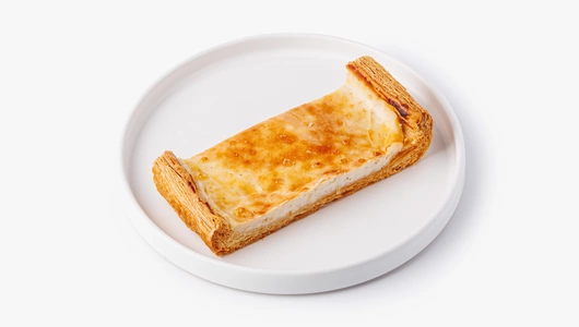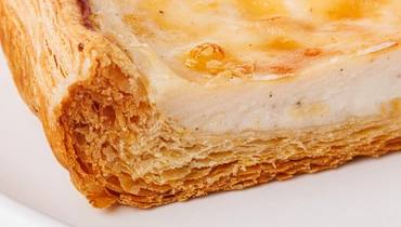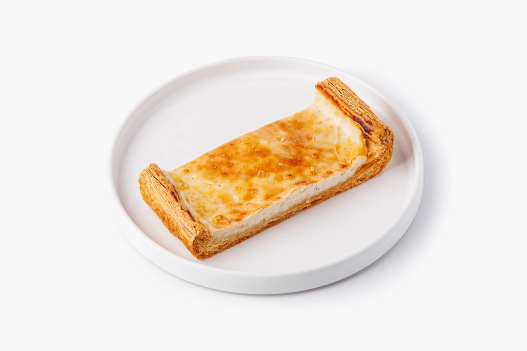 Классический флан с нежной молочно-сливочной текстурой и лёгким ароматом стручковой ванили. В основе — смесь молока, сливок и яиц с добавлением молотой ванили. Начинка запекается в слоёном тесте до плотного, ровного кремового слоя.