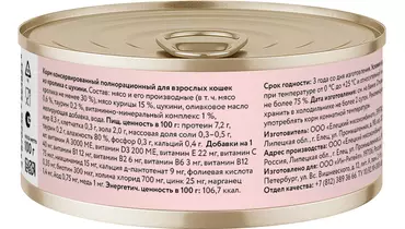 Консервы для кошек Florida - уверенность в качестве рациона для Вашего питомца! Florida - это натуральные и сбалансированные по своему составу консервы. Все ингредиенты проходят тщательный отбор, чтобы радовать Вашего любимца каждый день! • без ГМО, искусственных красителей и консервантов • высокая усвояемость питательных веществ • высококачественный белок • стандарт качества сырья Human Grade • ягоды и фрукты - источники натуральных антиоксидантов, витаминов и минералов Суточная норма: 30-50 г на 1 кг веса животного. Обеспечьте кошке постоянный доступ к свежей питьевой воде. Для кошек с 8 месяцев. Рекомендуется употреблять при комнатной температуре.