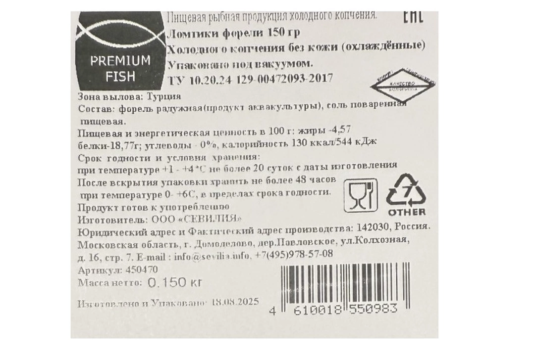Форель холодного копчения в нарезке — это изысканный деликатес с плотной, упругой текстурой и нежным, солоноватым вкусом, дополненным аппетитным ароматом дымка. Она идеально подходит для праздничного стола, бутербродов, канапе, салатов или как самостоятельная закуска. Продукт богат полиненасыщенными жирными кислотами Омега-3, белком, витаминами (A, D, E, группы B) и минералами (калий, магний, фосфор, селен), что делает его полезным для сердечно-сосудистой, нервной систем и общего восстановления организма. Страна производитель-Россия