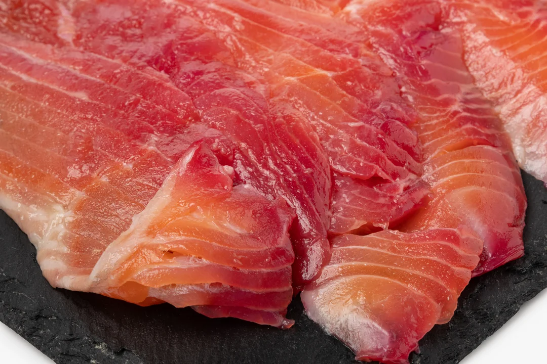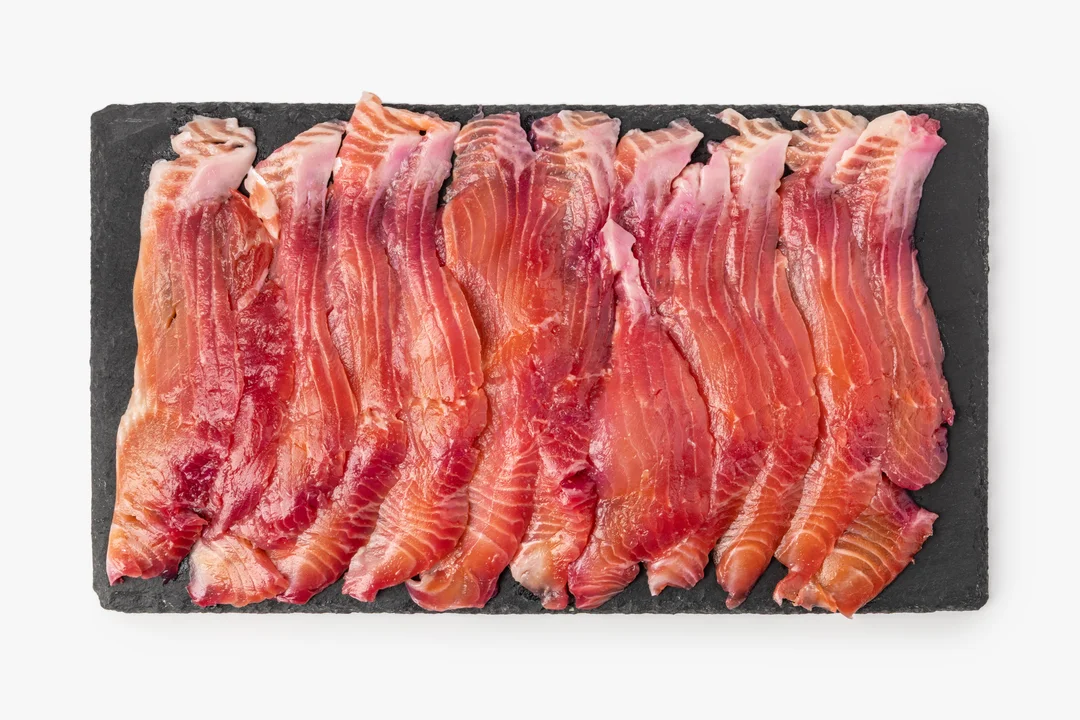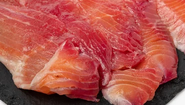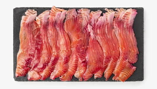 Ломтики слабосолёной форели красивого розоватого оттенка продаются на развес. У радужной форели нежное мясо с лёгкой солоноватостью. Свекольный сок добавляет ему цвет и едва заметную сладость, не перебивая естественный вкус. Готовый продукт можно выложить на рыбную тарелку, подать на хрустящих тостах, приготовить из него холодные закуски или салаты. Обратите внимание: в рыбе могут встречаться мелкие косточки